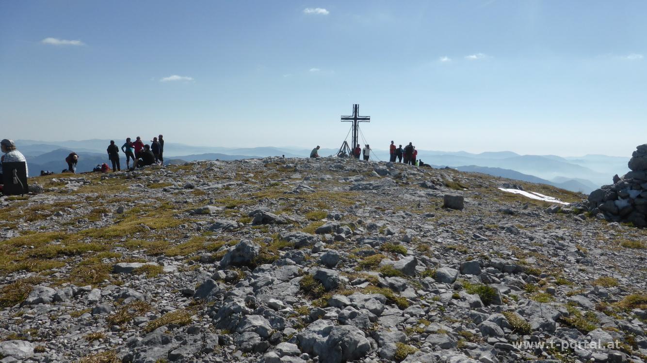 Ich hab eine gute Zeit erwischt und hab keine Wandergruppen direkt vor oder hinter mir und komme zügig voran. Zuerst ein paar Meter entlang einer Eisenkette, dann über die mittelsteile Leiter führt der Weg direkt hinauf. Es folgen Passagen mit Seilen und Stangen und es tauchen auch die ersten Neuschneereste neben dem Weg auf. Im Aufstieg wird auch der Blick über die Hügel der Umgebung immer besser. Auch das gut bevölkerte Gipfelkreuz am Hochschwab rückt ins Bild. Bald werden die Wanderstöcke wieder vom Rucksack genommen und es geht nach einem kurzen Abstieg zum Fleischer Biwak. Nun ist es nicht mehr weit, bis ich das Gipfelkreuz am Hochschwab erreiche. Nach tollem Rundblick steige ich auf der anderen Seite zum Schiestlhaus ab und verdrücke ein gutes Mittagessen.