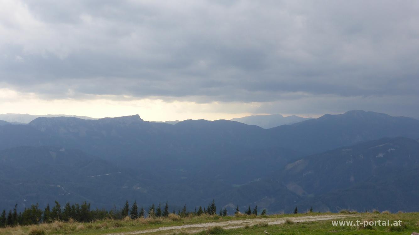 Auf den Gipfel hinter der Hütte (Höger, Göller und co.) schaut es schon bedrohlich nach Regen aus, deswegen nur schnell ein paar Fotos gemacht, die finalen Koordinaten berechnet und weiter gings. Bereits nach wenigen Minuten treffen mich auch die ersten Tropfen. Im Rückweg schnell an der richtigen Stelle zum Cache abgebogen, währenddessen ist aus dem Tröpfeln ein ordentlicher Schauer geworden. Danach auf dem immer rutschiger werdenden Untergrund runter zur Kleinzeller Hinteralm. Nachdem es weiterhin wie aus Kübeln schüttet nun im Laufschritt bergab, und zurück zum Parkplatz. Den ursprünglichen Plan, das Hochstaff noch mitzunehmen hab ich verworfen, war bei der Abzweigung schon gut durchnässt. Der entfernte Donner ist Gott sei Dank nicht ganz nahe gekommen und somit war es eine witzige Freitagsnachmittagsrunde.