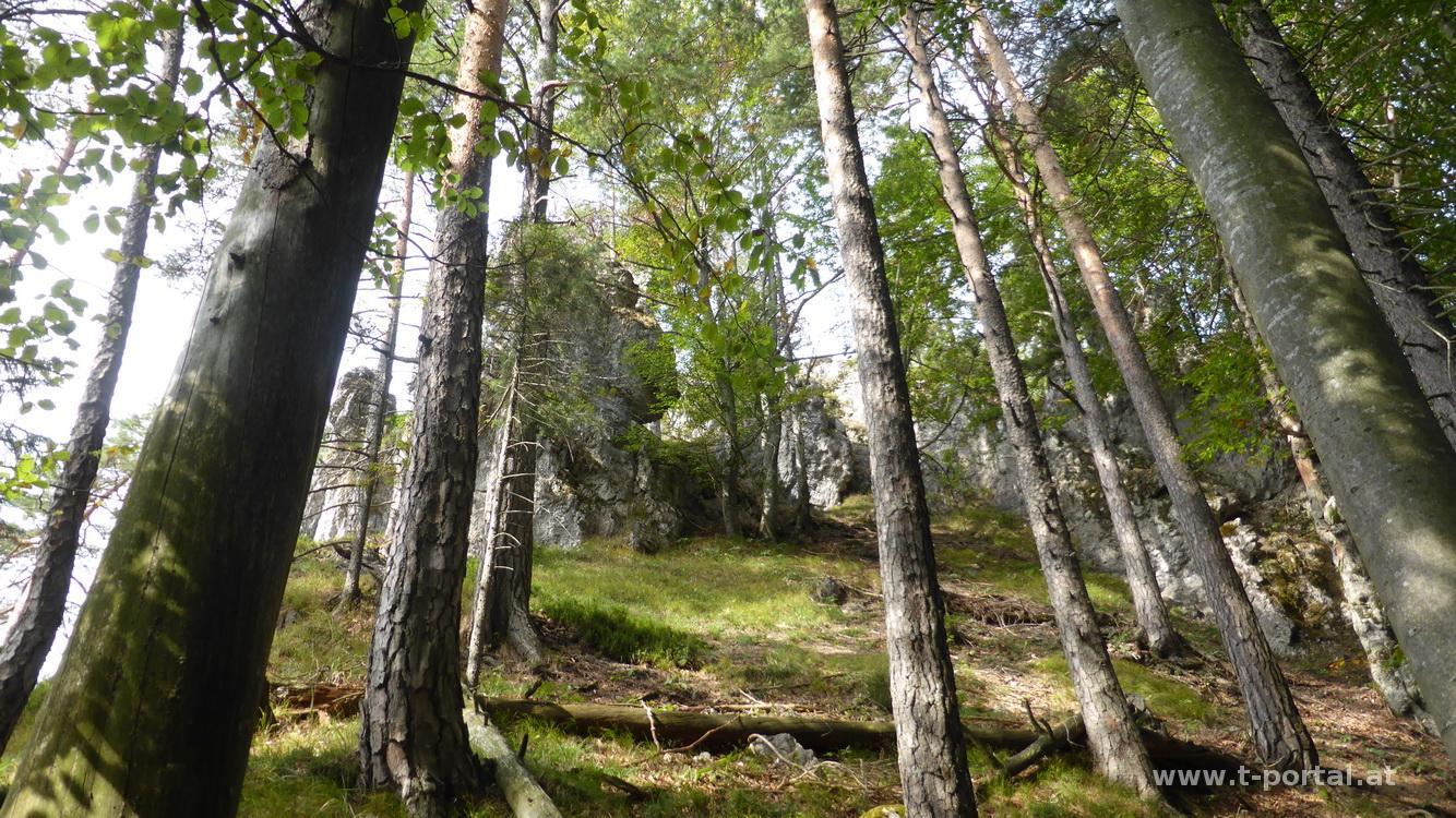 Das heutige Wetter sieht für den Nachmittag etwas wechselhaft aus, nachdem ich gestern schon genug Regen abbekommen habe, durchforste ich die diesjährige Tourenliste nach fehlenden Zielen in der Nähe. Dabei tauchen der Türnitzer Höger und der Gippel auf. Ich wollte schon länger von Türnitz auf den Höger gehen, also wähle ich diese Variante aus. Los gehts beim Parkplatz des Freibads in Türnitz, das heute eher nicht besucht ist :-) Von dort entlang des Kneipweges auf einer gemütlichen Straße dahin. Zuerst ist es flach, dann leicht ansteigend, um einige Kehren und dann ab in den Wald. Nach dem Regen ist der Untergrund etwas feucht und es liegen auch schon einige Blätter am Boden. Nun immer der Markierung folgend bergauf, bis es entlang der linken Hangkante weitergeht. So steigt man bis unterhalb des Geiersteins auf, den man bei Lust und Laune noch erklimmen könnte (lasse ich aus).