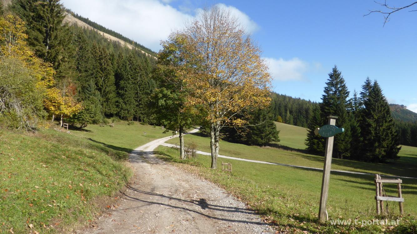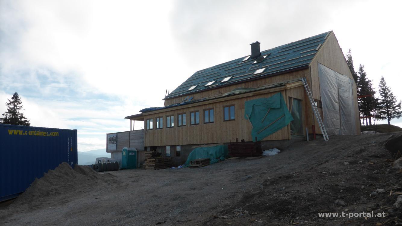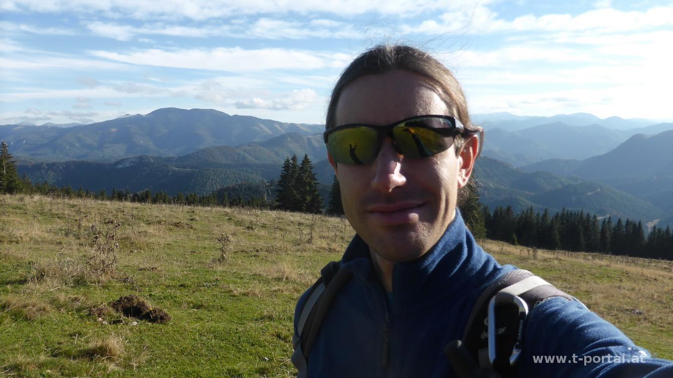 In Annaberg angekommen scheint noch immer die Sonne, also entschließe ich mich kurzerhand noch auf den Tirolerkogel zu gehen. Vielleicht habe ich dort mehr Glück mit der Hüttenverpflegung. Nach dem kurzen Marsch entlang der Bundesstraße sehe ich leider auch schon dem Zettel am Wegweiser, der auf die andauernden Bauarbeiten auf der geschlossenen Hütte hinweist. Ich geh trotzdem weiter, zuerst flach bis zum Bankerl am Gscheid, dann etwas steiler werdend auf der Forststraße bis zu einer Almhütte. Nun direkt über die Almwiesen bis zur Hütte und dem Gipfelkreuz. Hier sitze ich gemütlich in der Sonne und verdrücke meinen Reservevorrat an Mannerschnitten, während ich den Blick über die Berge schweifen lasse. Anschließend geht es am gleichen Weg retour nach Annaberg.