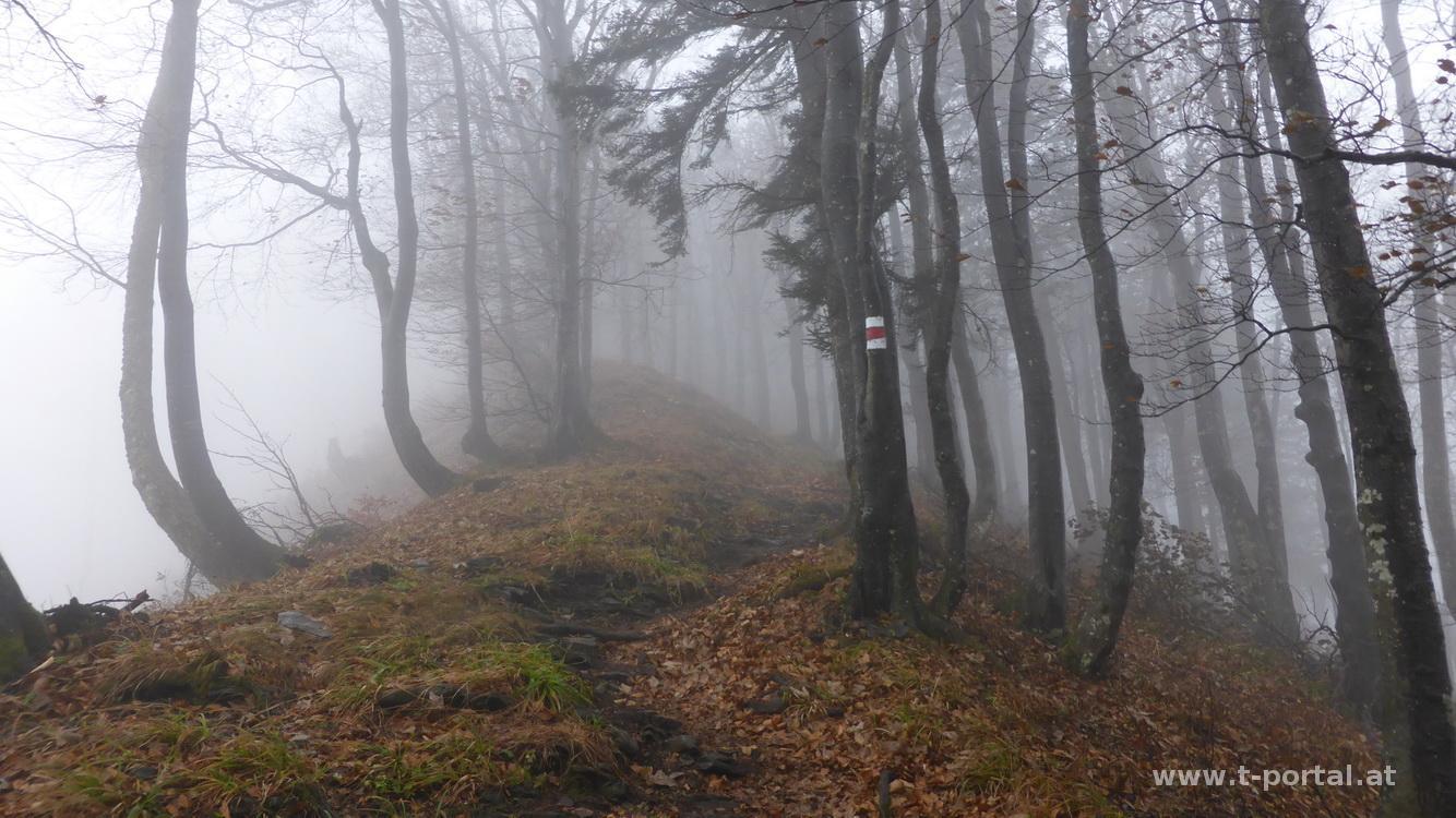 Über die Schipisten geht es zur Bergstation des Sessellifts (der sich sogar bewegt) und weiter zum Muckenkogel, wo ich endgültig die Nebelschwaden erreiche. Weiter geht es über Kammweg zur Hinteralm, heute ohne Ausblick. Nach Stärkung mit leckerem Braten geht es großteils auf Forststraßen zurück ins Tal.