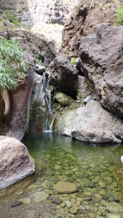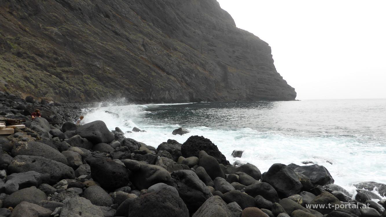 An der Playa de Masca angekommen blickt man auf die blaue See und einen steinigen Strand, vor einem Besuch des Sandstrandes weiter im Süden wird aufgrund der Steinschlaggefahr gewarnt. Vom Strand könnte man nun mit Boot und Taxi/Bus zurück zum Ausgangspunkt fahren, ich nehme jedoch den Weg zurück die Schlucht. Nachdem es inzwischen Nachmittag geworden ist, gibt es nun viel Gegenverkehr, wodurch ich genug Pausen mache. Dies ist in der warmen Schlucht auch wirklich notwendig. Nach einer Erfrischung bei einem kleinen Wasserfall komme ich wieder nach Masca. Auf der Rückreise folge ich zwei Autobussen, die den Gegenverkehr zum Ausweichen zwingen.