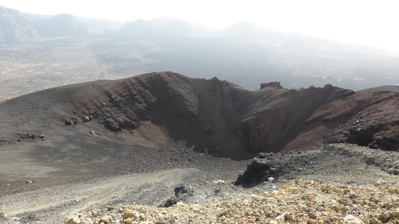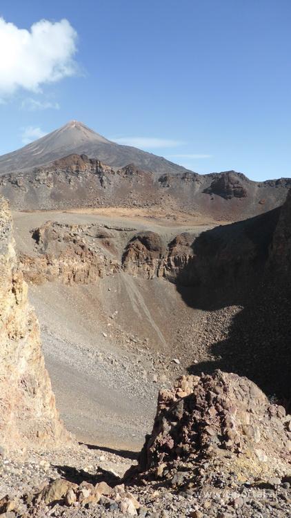 Nach ausreichend langer Pause mit Krater-, Teide- und Meerblick wandere ich zuerst das erste Stück am gleichen Weg retour, bevor ich nicht wieder Richtung Pico Sur auf- sondern direkt absteige. Das erste Stück ist mühsam über Fels- und Lavagestein zu gehen, dann wird der Untergrund lockerer und ich kann schnell - fast wie im Winter mit den Schneeschuhen - durch den Lavasand abrutschen. Das schont die Knie und den alten Wanderschuhen macht es auch nicht mehr viel aus. Nachdem ich so einige Höhenmeter absolviert habe, geht es vorbei am großen Narices del Teide Krater, um nach einer Hangquerung nochmal lustig dahin zu rutschen. Dann wird es im Lavagestein nochmal anstrengender, während am Ende des Weges schon lange der Parkplatz zu sehen ist - nach einer letzten Querung des Vulkanausläufers und kurzer Wegverwirrung erreiche ich den Ausgangspunkt. Ein wirklich spannende Tour, aber nur für trittsichere und ausreichend konditionierte Wanderer.
