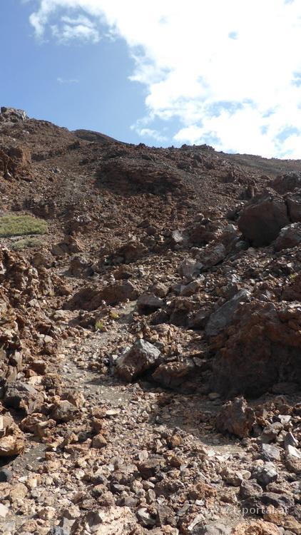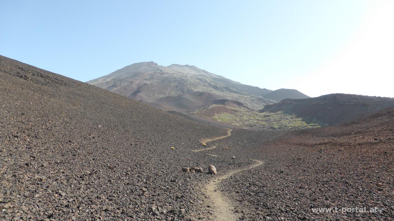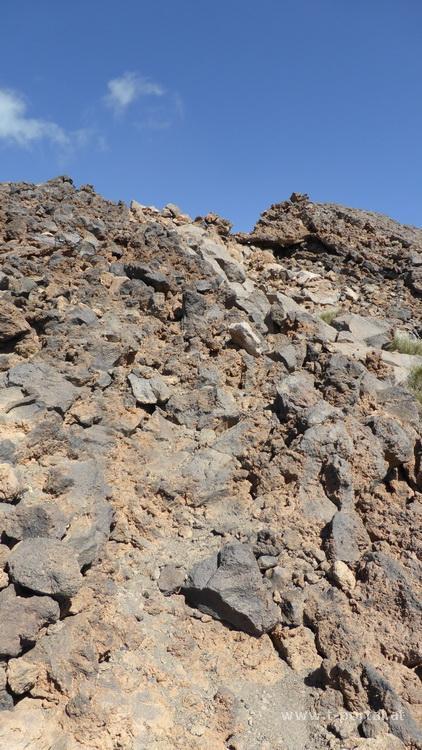 Heute geht es in den Teide Nationalpark. Natürlich würde ich gerne den höchsten Berg der Insel - den Teide - besteigen, jedoch sind seit mehr als zwei Wochen die Genehmigungen für die Gipfelbesteigung voll ausgebucht. Somit nehme ich eine nicht minder spannende und wesentlich weniger frequentierte Route und mache mich auf den Weg zum Pico Viejo. Das Auto parke ich am Aussichtsplatz Mirador de Chio neben der TF38. Es geht zuerst flach mit etwas Höhenverlust unweit der Straße nach Norden, bis ein kleines Wäldchen gequert wird und kurz danach den Weg nach rechts hinauf. Nicht wirklich steil wandere ich weiter bis zu vielen von Menschenhand aufgeschlichteten Mauern. Nun in einem kleinen Tal etwas steiler durch einige Kehren weiter bergan. Aufgrund des großen Höhenunterschieds vom Quartier nahe der Meereshöhe bis auf den Gipfel lege ich heute deutlich mehr Pausen ein und achte auf etwaige Kopfschmerzen, die jedoch ausbleiben. Nach dem ersten Krater teilt sich der Weg - Der mit N° 9 bezeichnete Pfad wird verlassen und es geht eher gerade bzw. leicht links weiter zum nächsten Krater. Bald wird der Weg steiniger und auch steiler, ein genauer Blick zu den nächsten Steinmännchen ist nie schlecht.