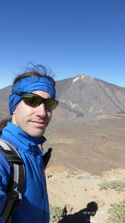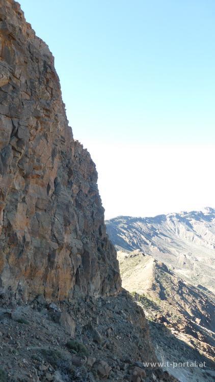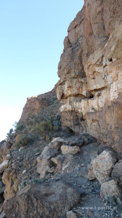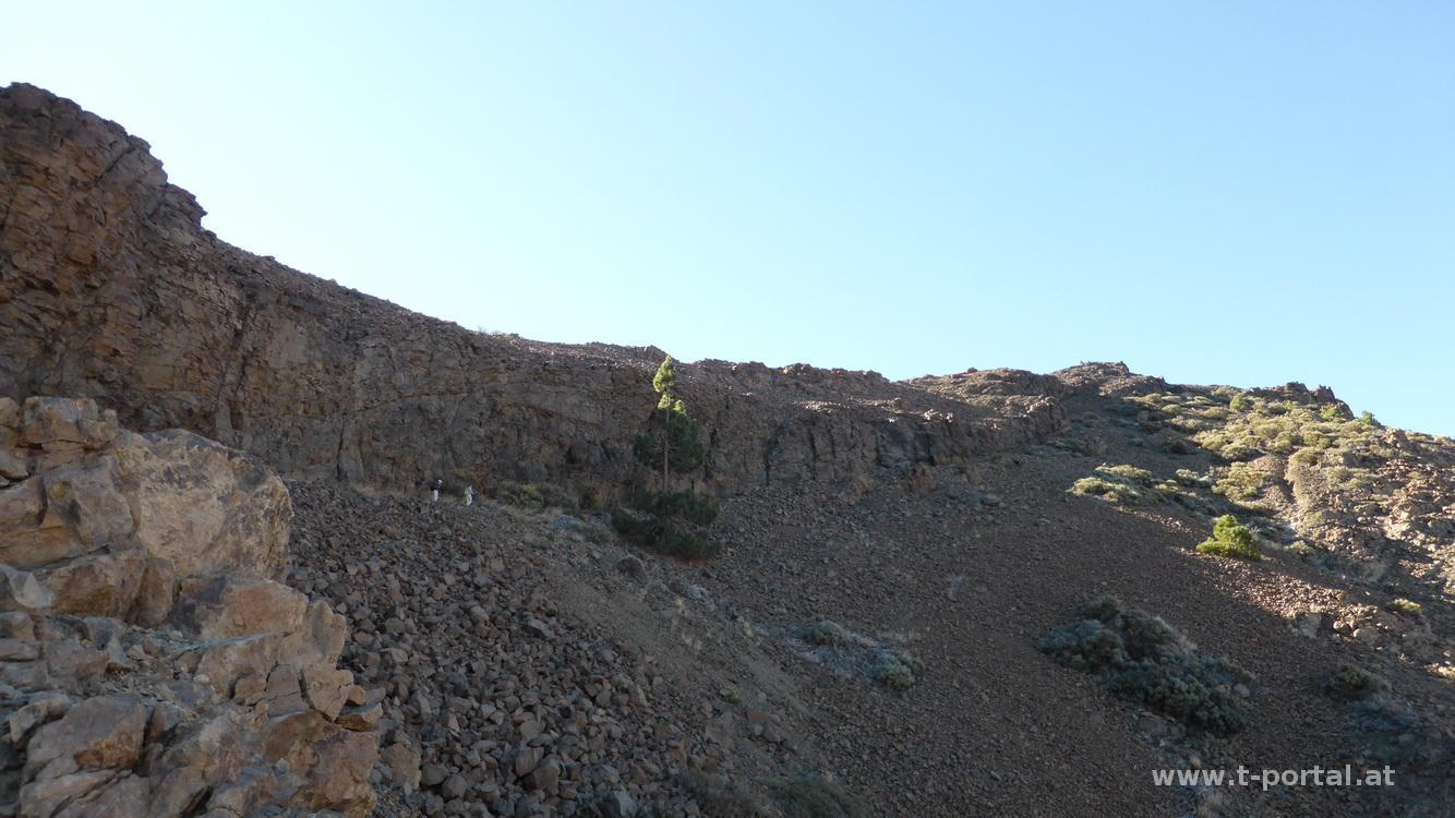 Zum Abschluss des Urlaubs geht es nochmal hoch in den Teide Nationalpark, wo ich heute den höchsten Punkt am Rand der Cañadas Del Teide besteige und die Roques de García umwandere (Kombination aus Tour 73 & 72 aus Rother Wanderführer Teneriffa). Nach der schon bekannten Anfahrt parke ich mein Fahrzeug beim Parador Hotel und wandere von dort entlang eines ausgetreten Pfades ein Stück hinab, quere die Piste und steige bald in vielen Kehren den Berg hinauf. Nun geht es zuerst rechts unterhalb einer Felsmauer hinauf, bis eine Wegkreuzung erreicht wird. Dieser folge ich Richtung Nordosten zum Gipfel, nachdem ich ein diskutierendes Wanderpaar überholt habe ("Schau dir die Querung an, da geh ich sicher nicht rauf" - "Komm Eva, das kannst du von hier unten ja gar nicht sagen!"). Der Weg wird nun steiler und schmaler und ist mit einigen Punkten an den Steinen markiert. Unterhalb der Wand geht es nun aufwärts, etwas Vorsicht ist geboten, bis nach einer Kehre mit Abstecher zum Ausblicksplatz der letzte Anstieg über größere Steine erfolgt.