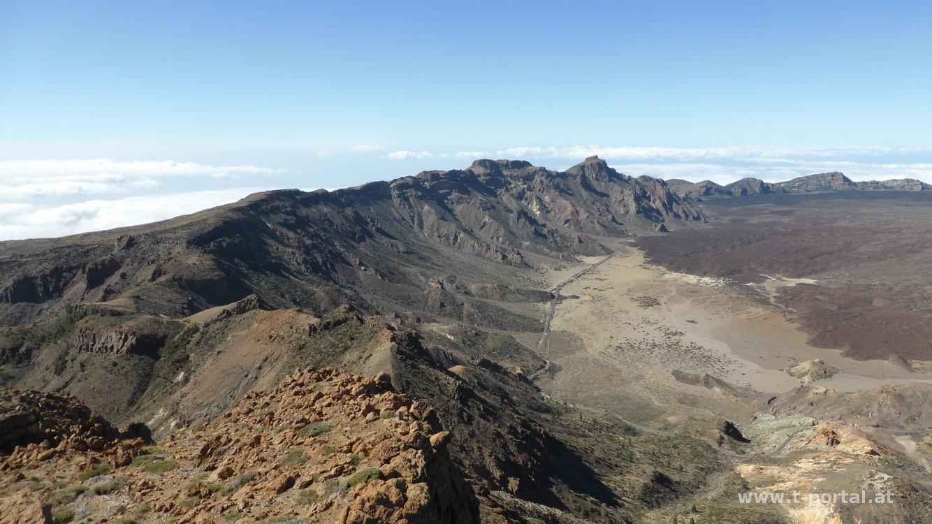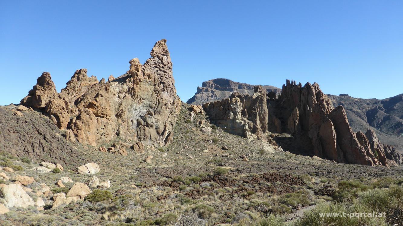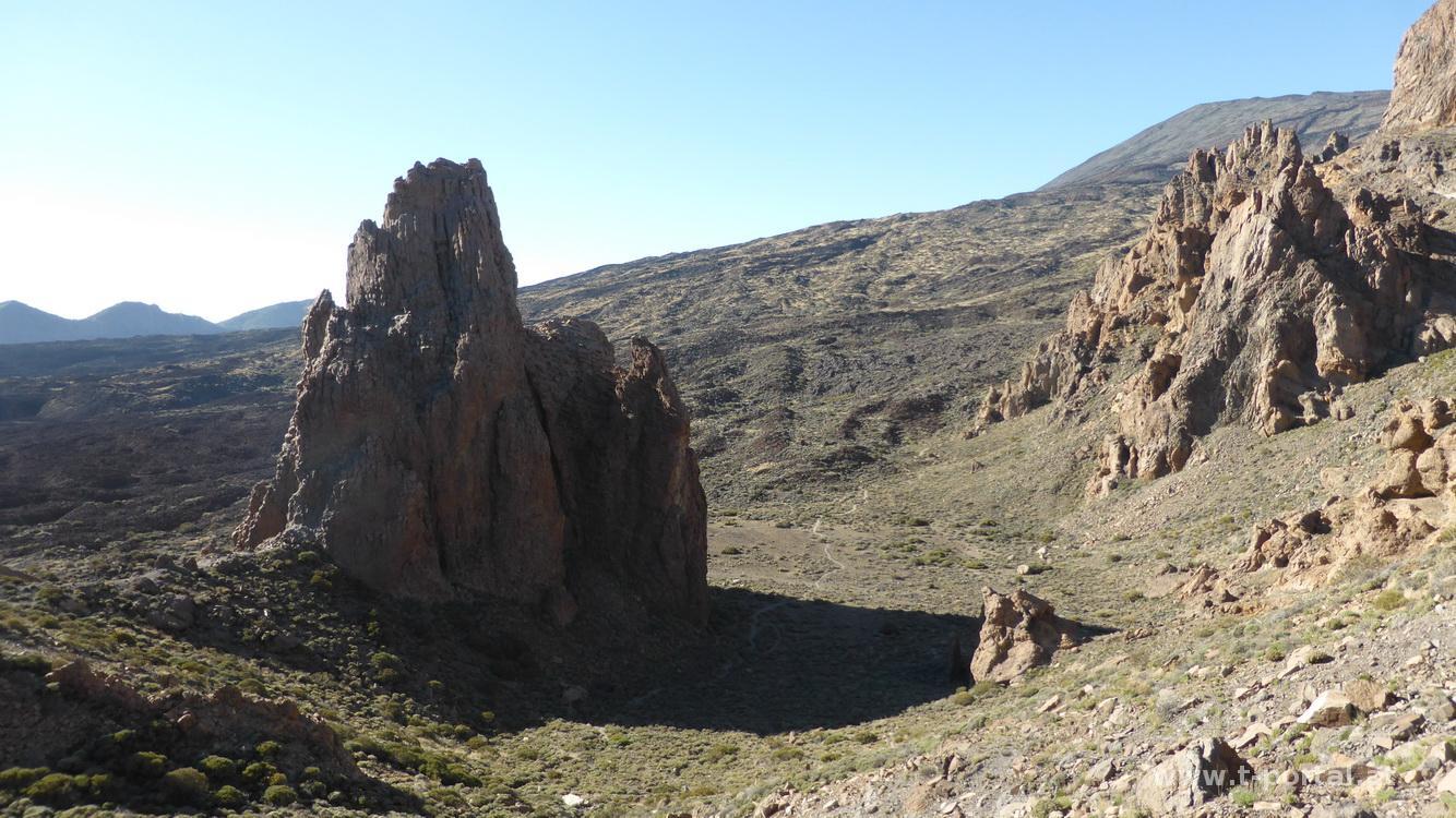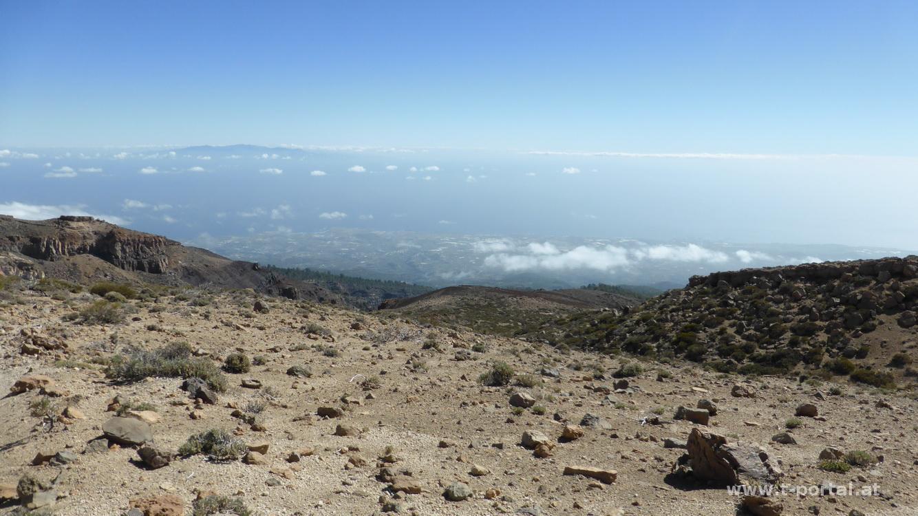 Oben finden sich einige Steinmauern zum Wetterschutz und schöner Ausblick vom Teide bis nach Gran Canaria. Nach ausreichender Rast in der Gipfelsonne geht es auf der anderen Seite hinab über einen kleinen Pass und runter bis zu einer Piste. Wem der Anstieg über meine Route zu schwierig aussieht, dem sei die Begehung in die andere Richtung empfohlen. Entlang der Piste geht es zurück zum Hotel, wo ich etwas unnötiges Gepäck ins Auto verstaue. Ein Stück entlang der Straße wandere ich rüber zu den Roques de García. Diese beeindruckenden Felsformationen lassen sich auf gemütlichen Pfad umrunden. Wer keinen Anstieg will, sollte jedoch umdrehen, bevor es bergab geht.
