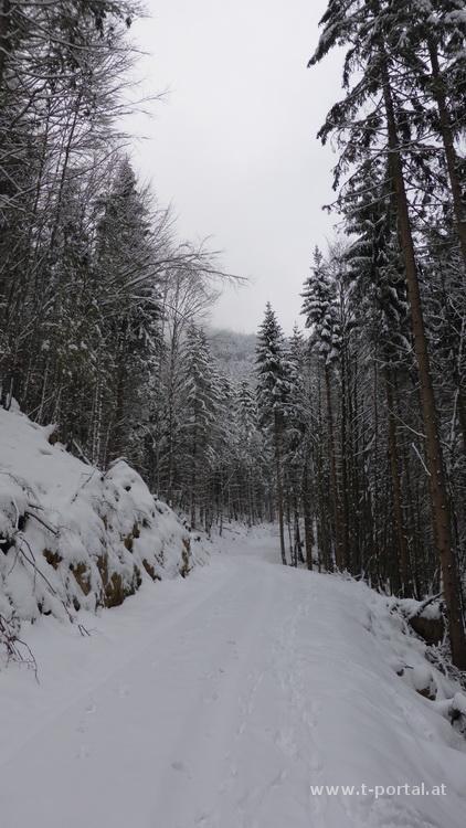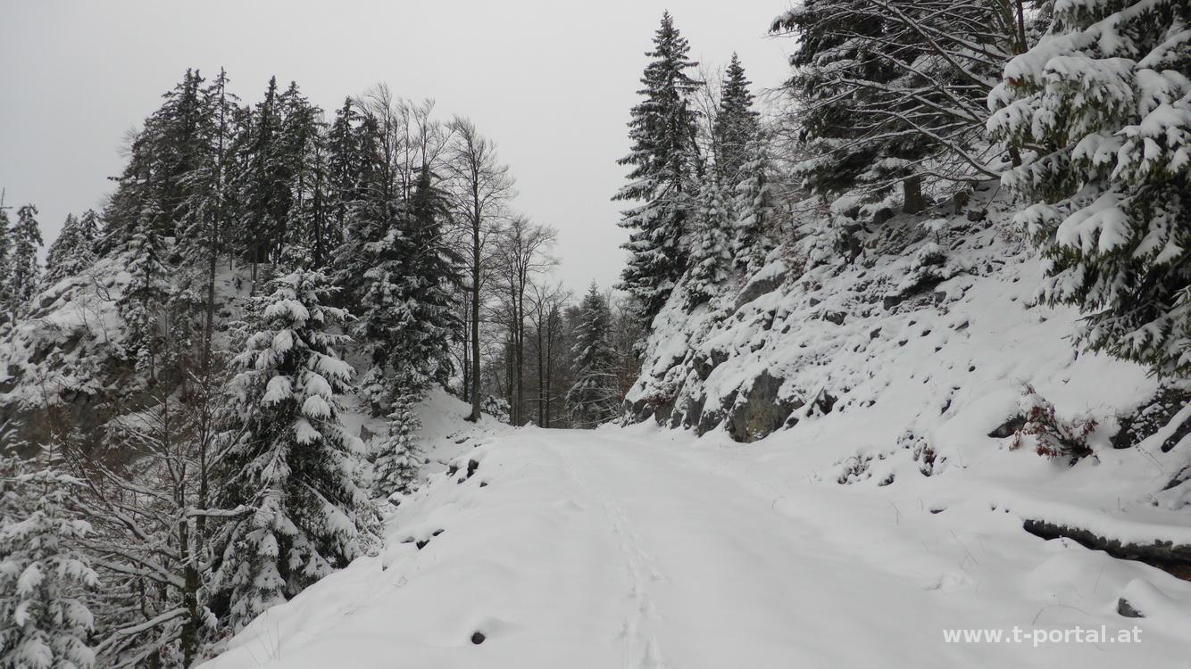 So erreiche ich wieder eine Forststraße, auf der es nach kurzem Anstieg zurück zum Aufstiegsweg geht. Nun auf meinen bekannten Spuren der Sonne entgegen zurück zum Auto. Anschließend zum Mittagessen und weiter zur zweiten Tour des Tages.