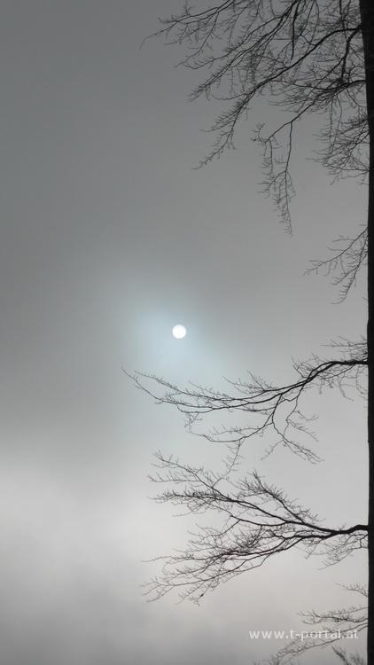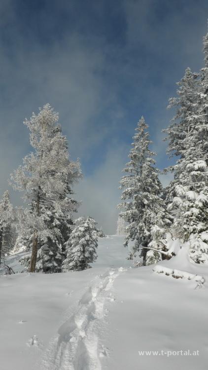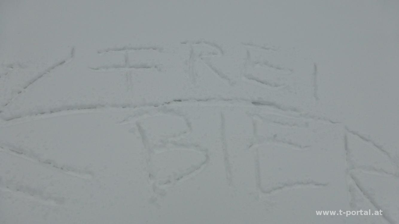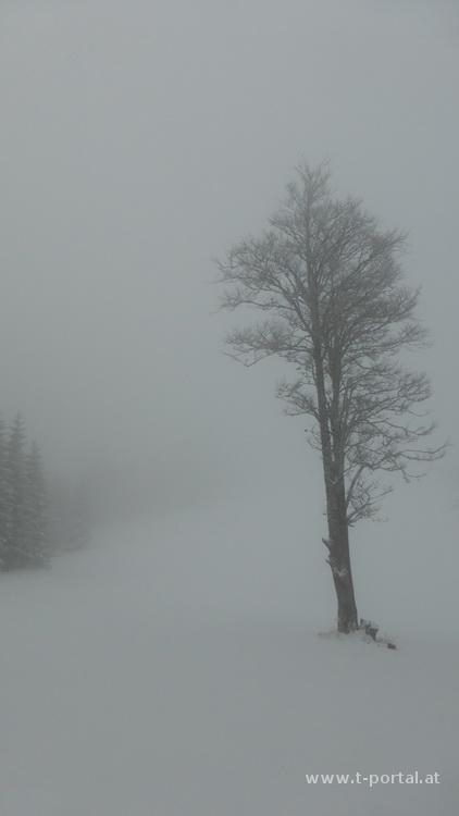 Vor zwei Wochen stand ich noch in der leichten Weste auf 3000 Meter, in Österreich schneite es diese Woche selbst in der Stadt. Deshalb gibt es heute die erste Wintertour auf zwei Berge, die noch in der Sammlung fehlen. Als Erster ist der große Sulzberg an der Reihe. Nach Anfahrt über schöne Schneefahrbahn bis ans hinterste Ende des Fadentals geht es ein Stück auf der Straße zurück bis zu einer Abzweigung mit Weginformation (neuer Weg, alter Weg führt durch Wildschutzgebiet). Nun immer entlang einer Forststraße durch Pulverschnee aufwärts. Das Wetter ist heute noch grau in grau, oben sieht es nach Nebel aus. Ich folge den nicht vorhandenen Spuren, gehe um einige Kehren und hinterlasse dabei ein paar Hinweise im Schnee. Cirka 150hm vor dem Ziel wird die Forststraße verlassen und es geht links an einem einzelnen Baum vorbei auf eine steile Wiese. Nachdem ich die Schneeschuhe dabei habe, kommen sie nun vom Rucksack an die Füße - ich sinke im Pulverschnee zwar trotzdem deutlich ein, die Frontzacken reduzieren jedoch das zurückrutschen.