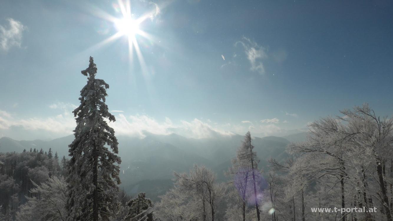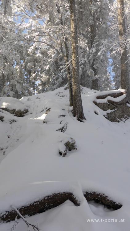 Nach dem direkten steilen Anstieg im Nebel wird es weiter oben wieder flacher. Die letzten Meter zum Gipfelkreuz werden etwas unterhalb des Bergkamms absolviert. Am Kreuz angekommen bläst ordentlich der Wind und ich sehe Skitourenspuren von gestern, die von der anderen Seite auf den Gipfel führen. Nach kurzer Trink- und Schreibpause wandere ich am Kamm weiter Richtung kleinen Sulzberg. Es geht zuerst relativ flach dahin, die Skitourenspuren zweigen Richtung Nordosten ab und für mich geht es bald durch den Wald hinab zu einer Forststraße. Inzwischen hat sich die Sonne den Weg durch die Wolken gebahnt und ich finde mich im Winterwunderland wieder. Nach Abstieg geht es ein Stück die Straße entlang und dann einige Meter in den Wald hinauf zum kleinen Gipfelfelsen, der wohl der kleine Sulzberg sein müsste. Anschließend retour zur Forststraße und dann laut GPS Track in einen Graben hinab. Hier liegen einige umgefallene Bäume herum, nachdem ich die erste Hälfte noch mit Schneeschuhen abgerutscht bin, bewältige ich den weiteren Weg über Bäume und Steine doch lieber zu Fuß.