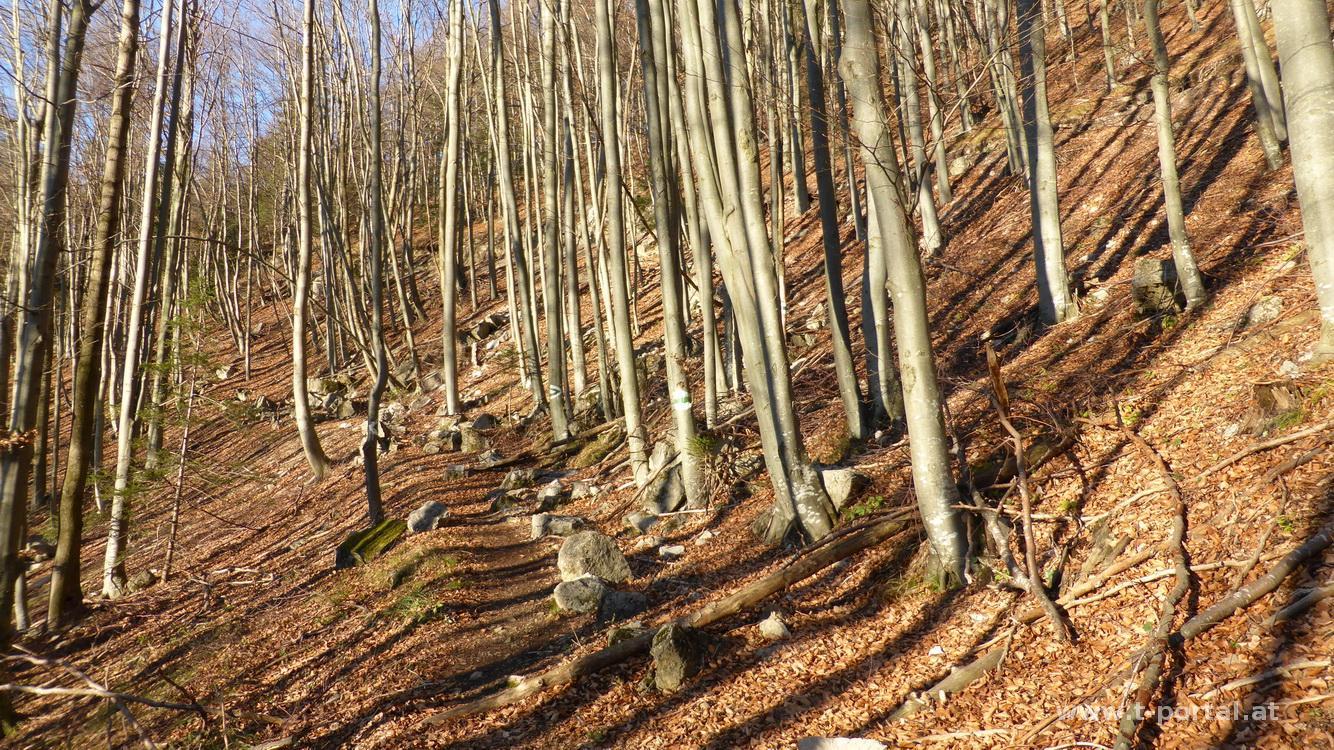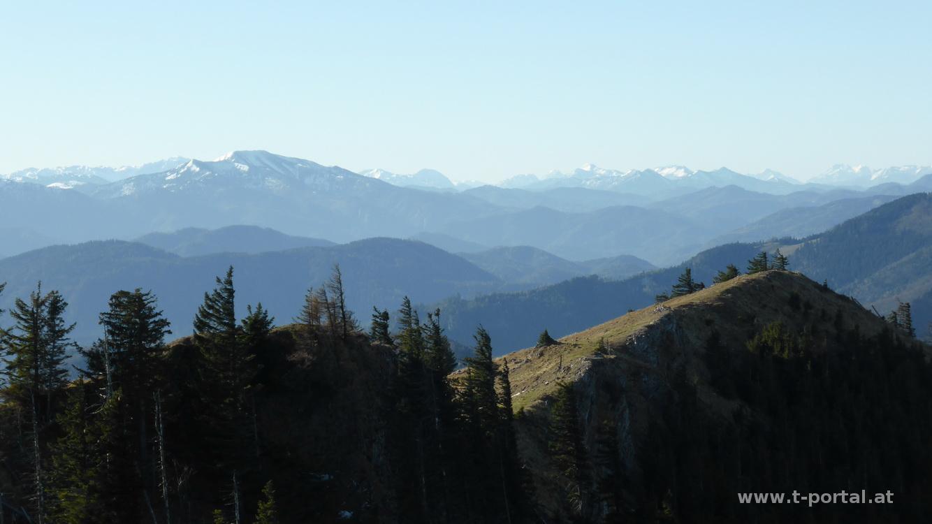 Nach langer Rast bei tollem Ausblick geht es wieder hinab zur Kreuzung mit dem Viehgrabenweg. Nun nicht wieder am Wanderweg sondern einfach auf der parallel dazu fast flach verlaufenden Forststraße zurück zum Bettelmankreuz. Von dort geht es hinauf zum Kirchwaldberg und mit etwas auf und ab weiter bis zu einem Forstweg. Bald treffe ich auf den Wanderweg, der mich bereits mehrmals vom Adamstal hierher geführt habe. Den Normalweg Richtung Schutzhaus verlasse ich wenige später und steige am unmarkierten, aber deutlich ausgetretenen Pfad zu den Schiwiesen auf. Vorbei an den Liften stehe ich nach dem letzten kurzen Anstieg beim hohen Gipfelkreuz des Unterbergs, wo ich mich erst Mal in die Sonne setze.