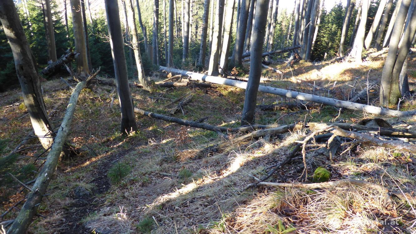Nach Jause in der Sonne geht es ein Stück weiter Richtung Brennalm und dann am Jägersteig hinab ins Tal. Ich hab mir eingebildet, dass der früher erst weiter unten begonnne hat, nachdem ich aber einen Steinhaufen mit Markierung seh, werf ich mich da - anfangs etwas steil - hinab Richtung Tal. Auf der zweiten Hälfte war ich wohl etwas abseits vom Weg, so geht es über Forststraße und quer durch den Wald hinab bis zum Gscheidboden. Nachdem auf der Wiese so schön die Sonne scheint, bleib ich hier lange liegen, bevor es ab in den kalten Nebel und auf der Forststraße zurück zum Ausgangspunkt geht.