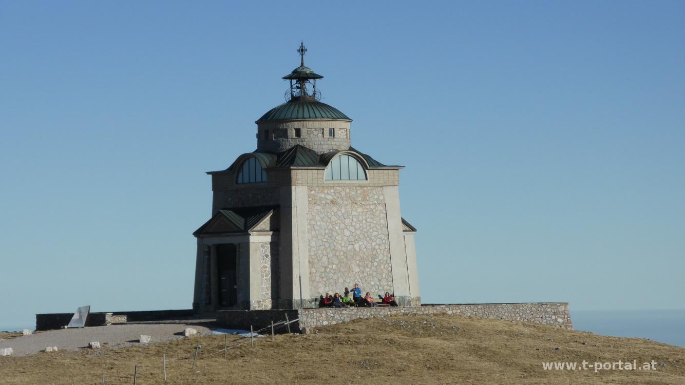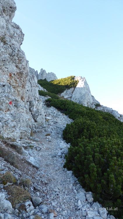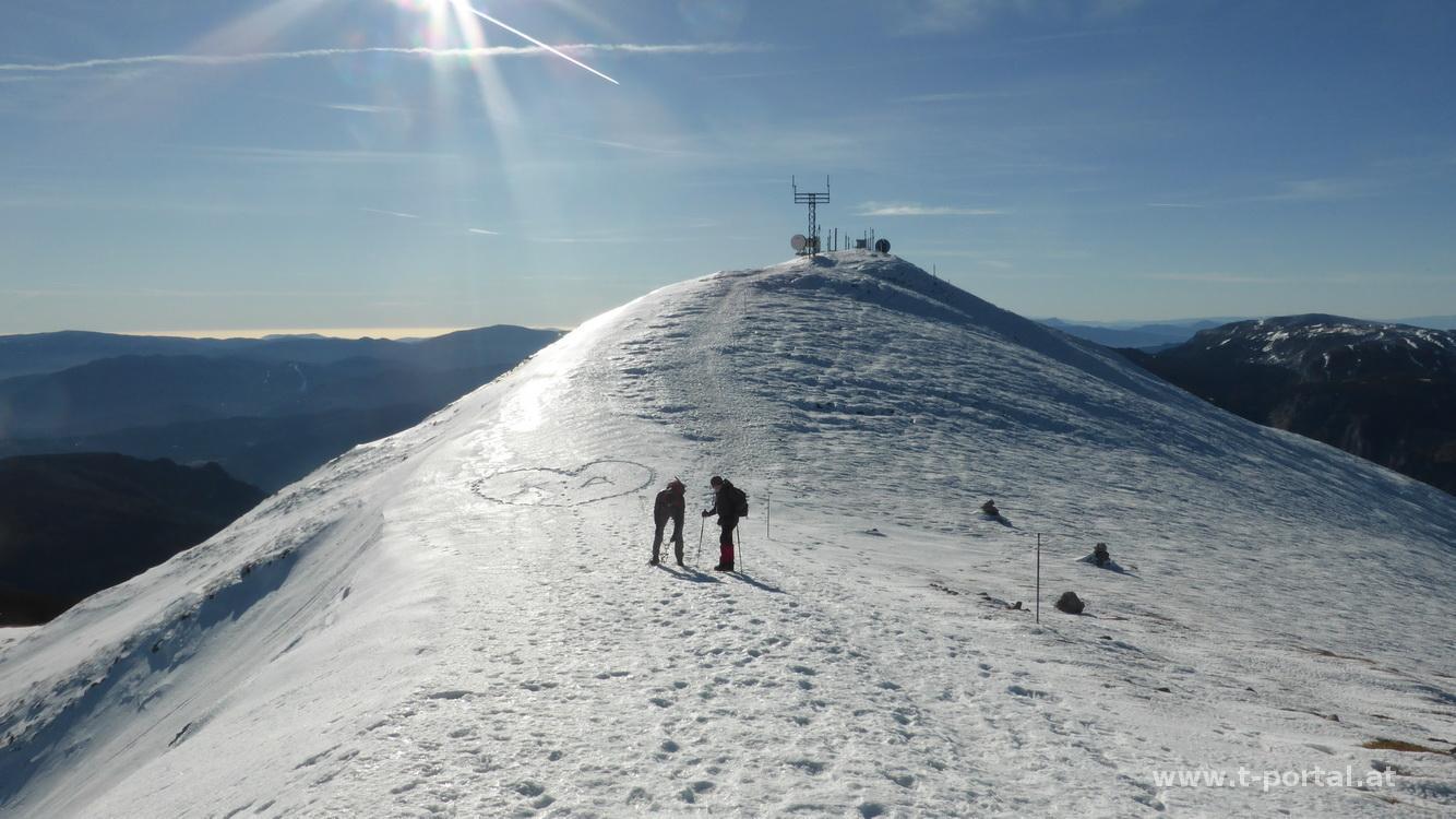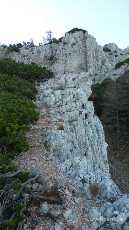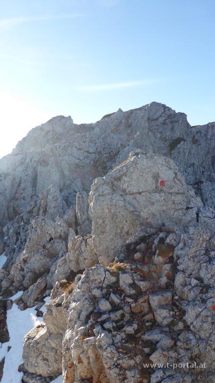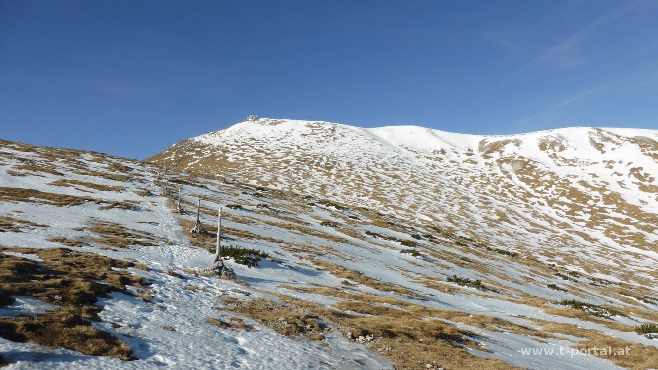 Hier pausiere ich kurz und sondiere die Lage, bevor es auf den gut sichtbaren Novembergrat geht. Nach anfangs steilem Gehgelände nehme ich bald die Hände zur Hilfe und folge den roten Punkten bergauf. Weiter oben habe ich einen schönen Blick rüber zum Nandlgrat auf der einen und den oberen Herminensteig (vermut ich mal, der fehlt mir noch) auf der anderen Seite. Der Weg ist ziemlich trocken, wenige Schneereste gibt es nur im obersten Teil. Vorsicht ist trotzdem geboten, geht es doch an manchen Stellen ein gutes Stück hinab. Nach einigem Anstieg seh ich auch schon den Gipfelkamm mit Klosterwappen und Fischerhütte, brauche jedoch noch ein bisschen, bis ich den Ausstieg in der Nähe des Damböckhaus erreiche. Über Latschen geht es runter auf die Straße und weiter Richtung Gipfel. Ich folge den Stangen und gelben Markierungen über und neben dem Schnee und stehe nach gemütlichem Anstieg bald bei der Sendeanlage und dem Gipfelkreuz. Wie so oft bläst ganz gut der Wind, dafür ist die Aussicht genial. Nach Fotorunde geht es weiter zur Fischerhütte, der ausgetretene Weg dorthing ist ziemlich eisig und ich seh sogar zwei Leute mit Steigeisen. Bei der Fischerhütte ist erstmal Rastpause angesagt.