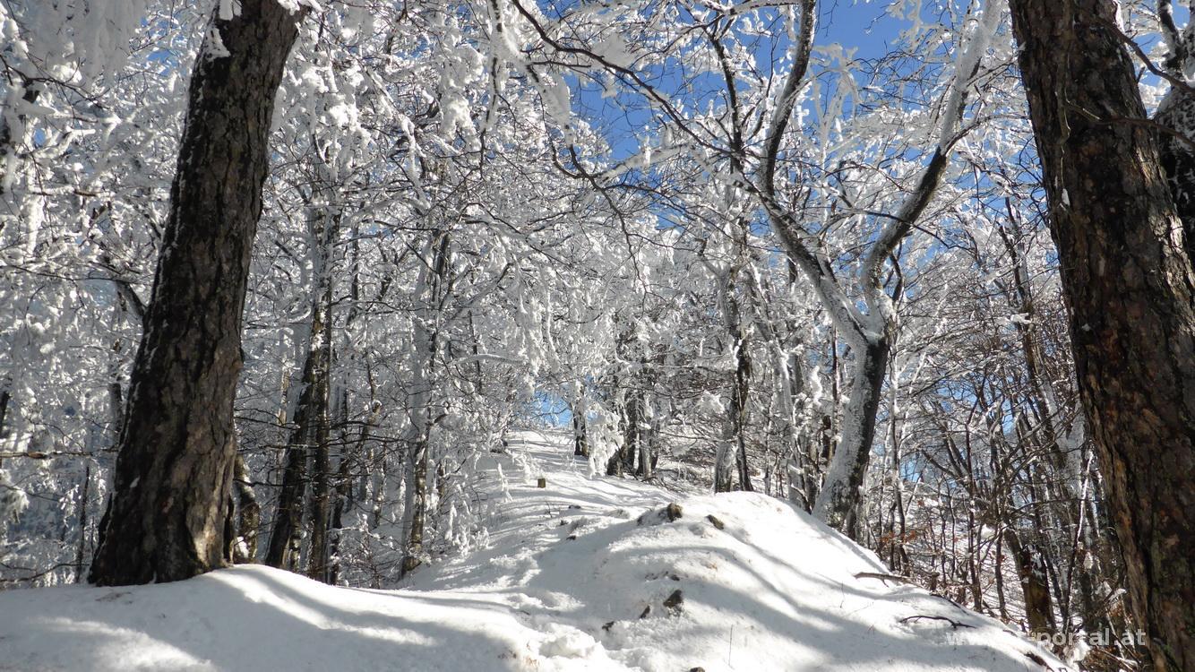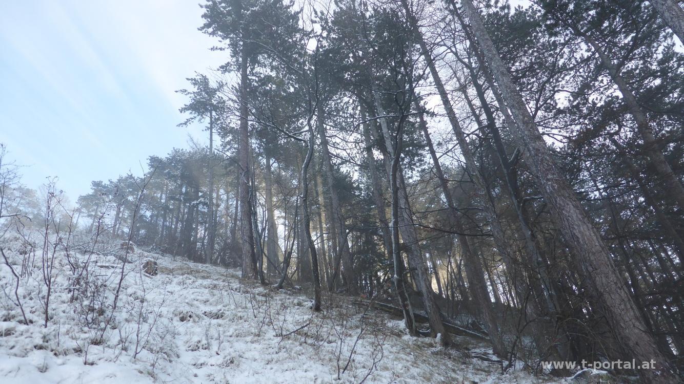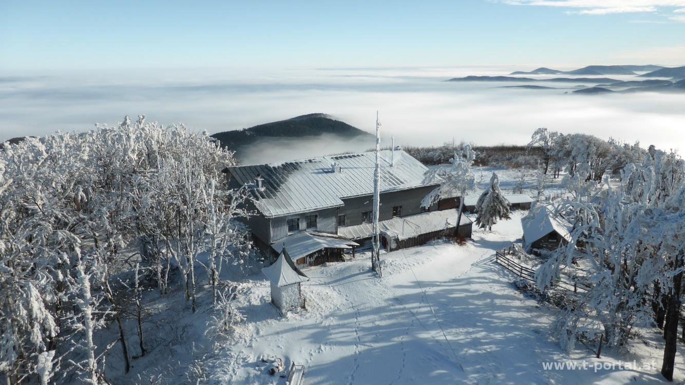 Heute soll es zumindest ein paar Sonnenstunden über dem Nebel geben, also such ich mir ein Ziel, das ich dieses Jahr noch nicht besucht habe (*gg*). So mach mich auf zu einer kurzen Runde aufs Hocheck. Ich starte meine Runde bei den Fischteichen im Höfnergraben. Nach ein paar Minuten auf der verschneiten Forststraße zeigen links die Wegweiser zum Hocheck. Angeblich ist an Wochenenden wieder das Schutzhaus geöffnet, ob das jetzt stimmt, hab ich nicht weiter erforscht. Nach kurzem Anstieg durch den Wald folgt ein flaches Stück bis zu einem Holzlagerplatz, wo es immer steiler und bald in Kehren den Berg hinauf geht. Ein paar Zentimeter Schnee hat es doch, für die Schneeschuhe oder sonstige Winterausrüstung jedoch deutlich zu wenig. Irgendwann durchschreite ich die Nebelgrenze, quere eine Forststraße und steige unter den Bäumen, die mich mit tauendem Schnee bewerfen weiter hinauf.