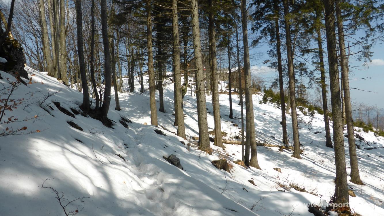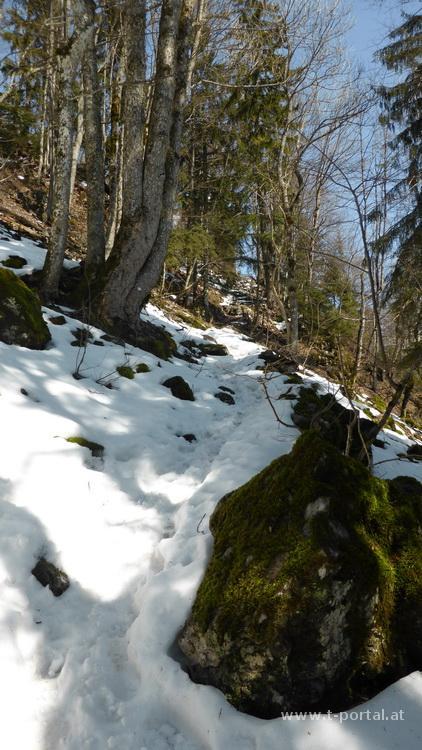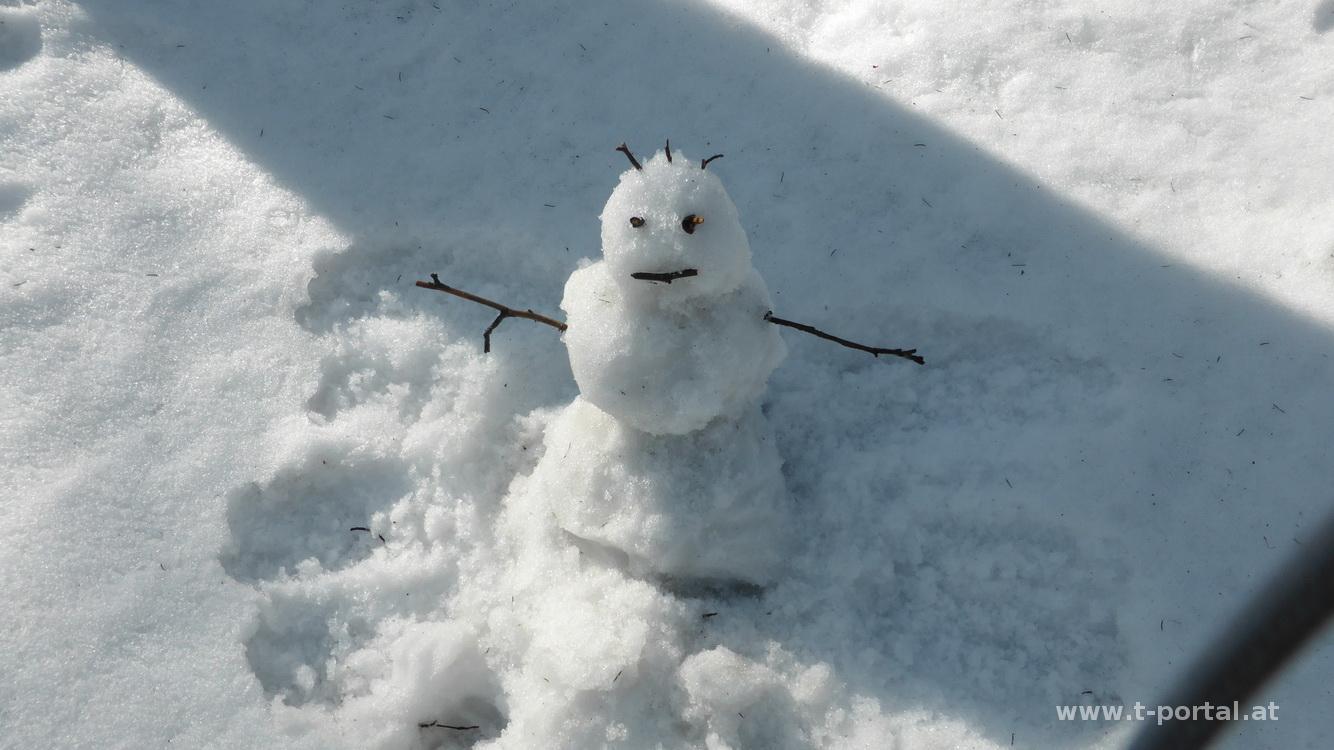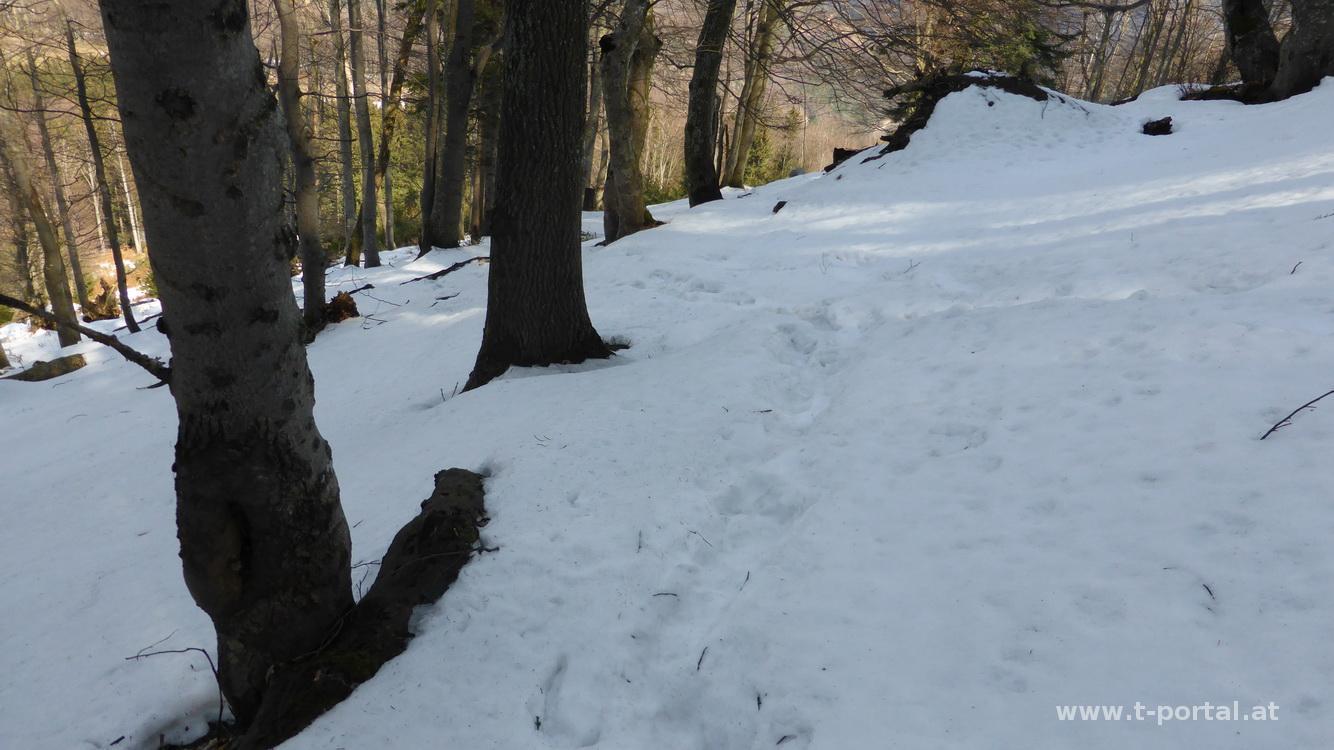 Nach ausgiebiger Rast geht es auf der Schattenseite wieder bergab. Hier liegt deutlich mehr Schnee und ich rutsche fröhlich auf den vorhanden Spuren bergab. Im patzigen Schnee bastel ich unterwegs noch schnell einen Schneemann, bevor ich mich den nächsten Kehren zuwende. Im unteren Teil wird aus dem schönen Schnee dann mehr eine Gatschpartie, aber bald ist die Ebenwiese erreicht. Hier geht es auf der anderen Seite nochmal entlang von Forstarbeitsspuren hinauf und entlang der Forststraße weiter. Bald ist der zweithöchste Punkt erreicht, es geht durch ein Gatter und nun immer bergab. Nun wechselnd über Wiesen und Waldwege bis zu einem Bauernhof, vorbei an Hirschen und zurück ins Tal. Entlang eines Bachs geht es zurück zum Ausgangspunkt.