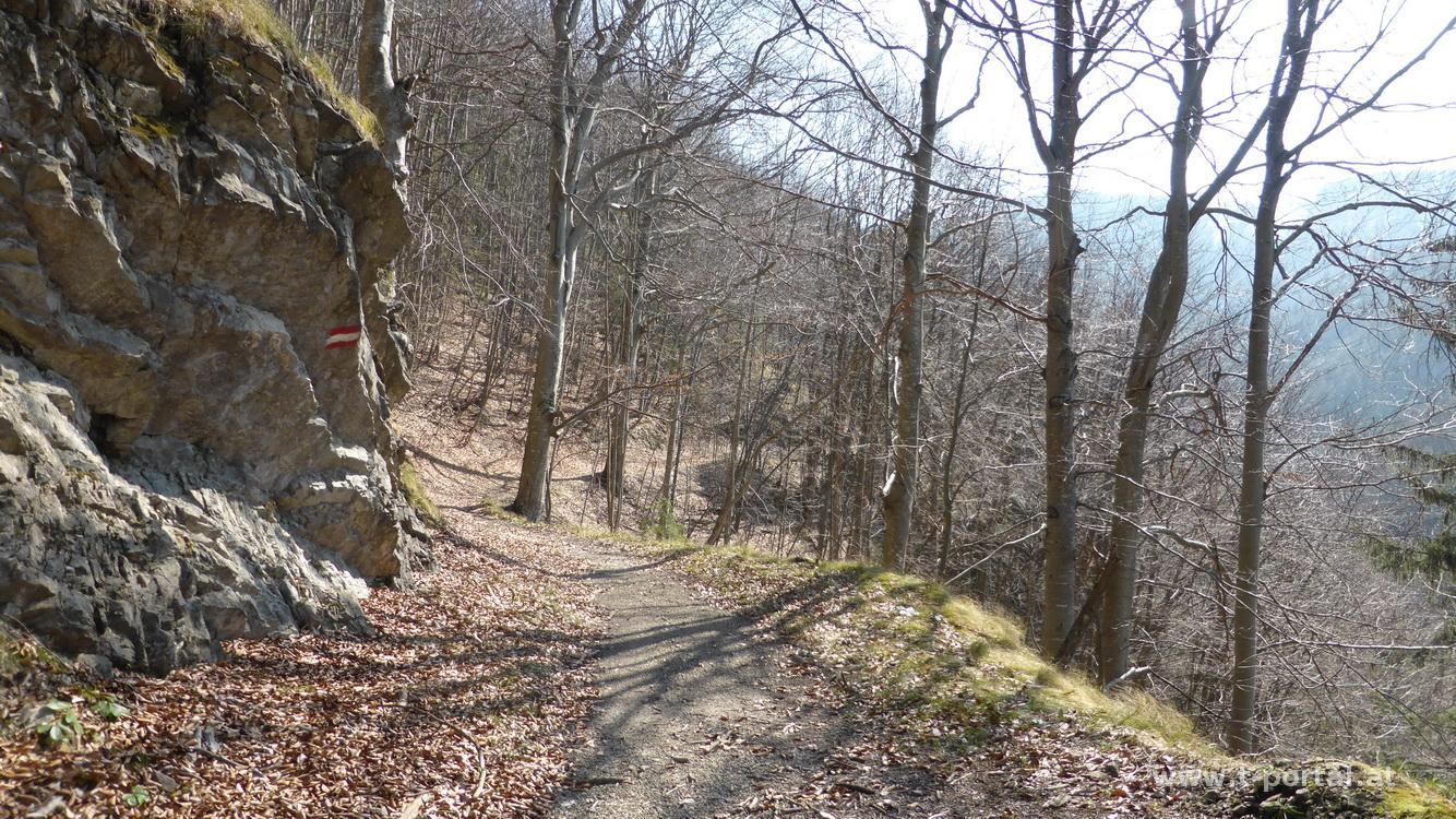Nach dem gestrigen Osterschmaus geht es heute wieder ab in den Süden und rauf auf den Berg. Ich hab mir die Wanderung auf den Hohenstein aus dem Soistal ausgesucht und begehe die gleiche Route wie vor zwei Jahren. Geparkt wird bei der Kreuzung zum Abstiegsweg und ich folge der Asphaltstraße noch einige Meter im Sonnenschein entlang des Bachs. So gelange ich bis zur Abzweigung, wo es rechts zum Gscheid Sattel und Eisenstein und nach links zum Hohenstein geht. Nun immer der Forststraße nach gemütlich hinauf, das Laub raschelt unter meinen Füßen und in der warmen Sonne lässt es sich auch ohne Jacke gut aushalten. Nach einer kleinen Bachquerung in einer Kurve wird es steiniger und ich erreiche die Wiese unter einem Forsthaus.
