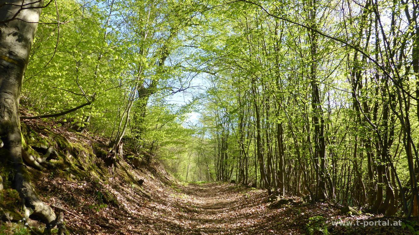 Anschließend ein Stück am Kamm dahin, durch etwas urigen Wald und bald wieder auf Forststraßen geht es ein Stück Richtung Weißenkirchen, wobei wir zwischendurch Ausblick vom Schneeberg bis zu den Aflenzer Staritzen haben. Irgendwan biegen wir in den Graben ab, der zurück Richtung Heudürr führt. Über etwas feuchte Traktorspuren geht es vorbei an einem Biotopsteich bis wir wieder die Donau im Blick haben, die Bahntrasse queren und das Stück am Radweg zurück zum Ausgangspunkt gehen.