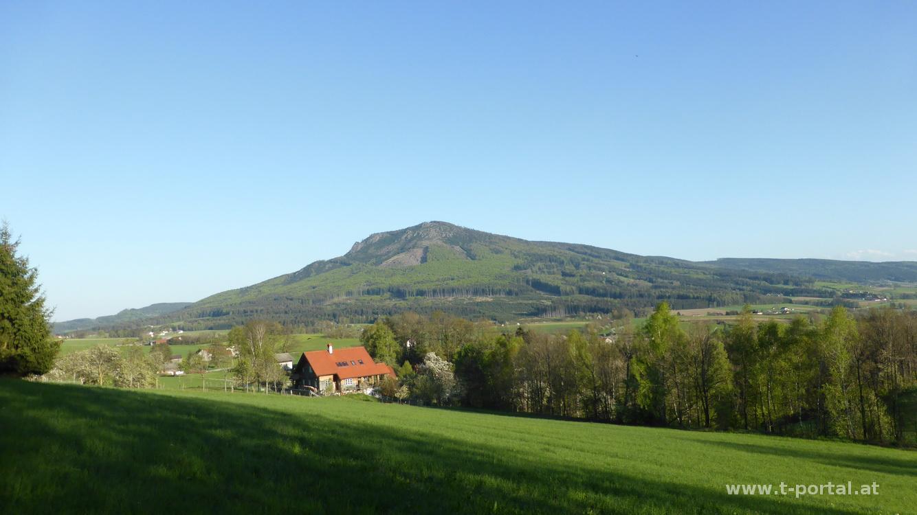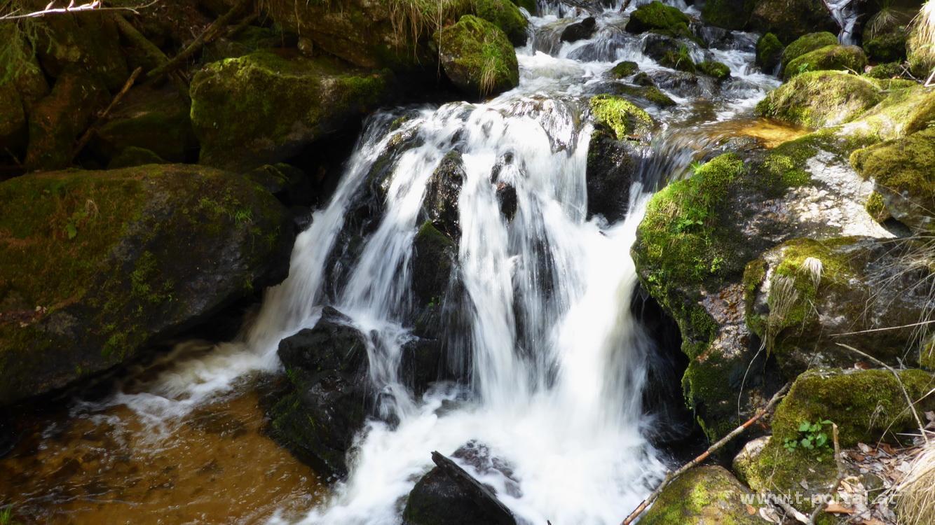 Bevor ich dieses erreiche besteig ich noch eine Felsformationen, bevor es durch den Laubwald hinab zum Kreuz geht. Von hier schöner Ausblick ins Tal und zum Ostrong. Deutlich steiler als im Anstieg geht es nun hinab ins Tal, eine Stelle wird mit einer Steigleiter erleichert. Das letzte Stück geht es auf einer Asphaltstraße und vorbei an einigen Gehöften und blühenden Bäumen zurück zum Forellenhof. Die Ysperklamm ist auf jeden Fall einen weiteren Besuch wert!