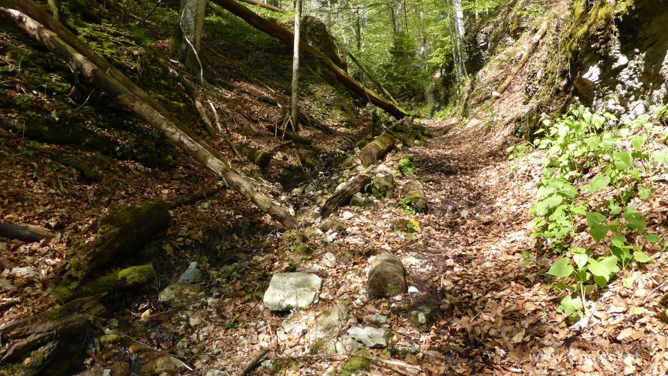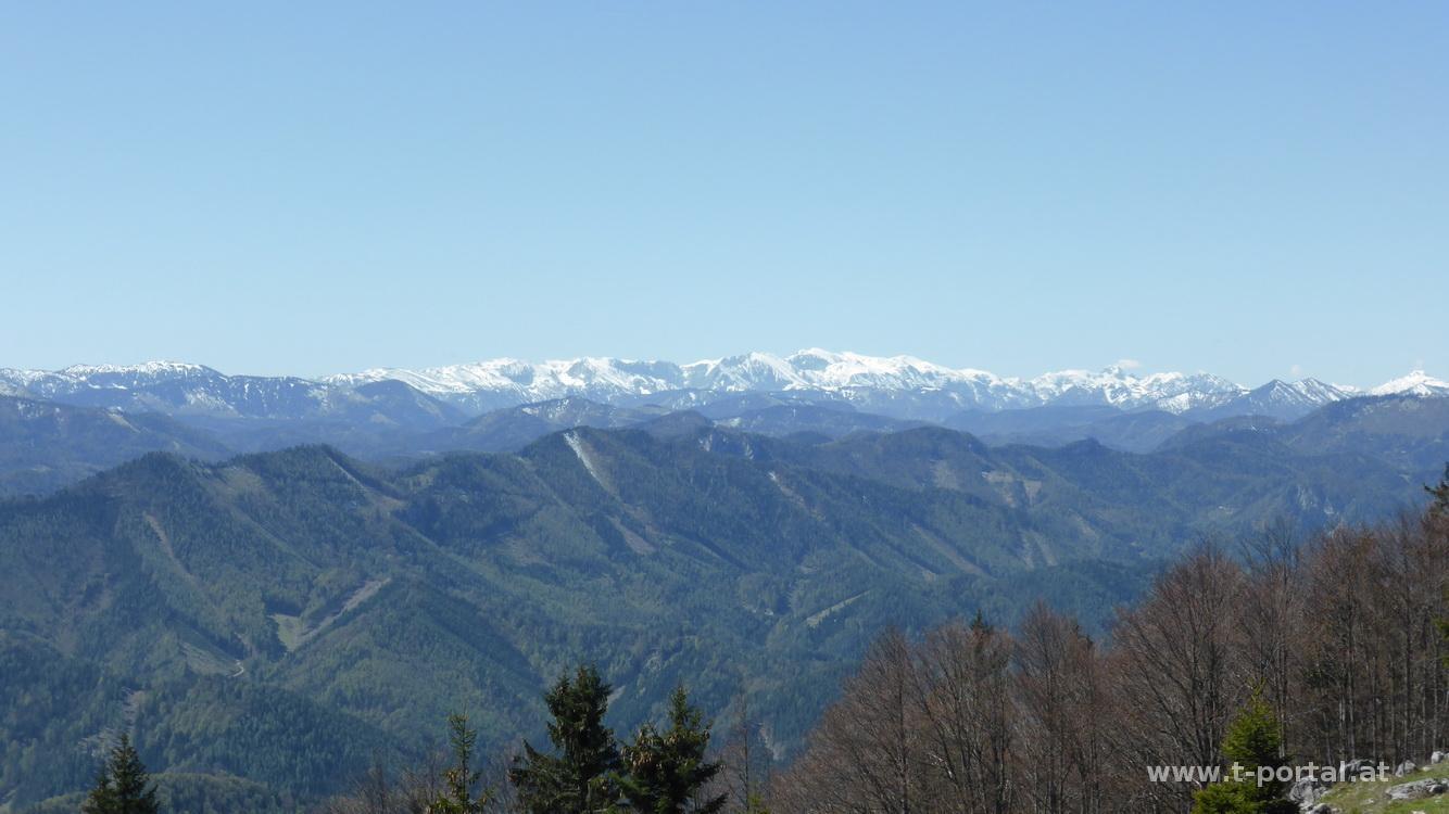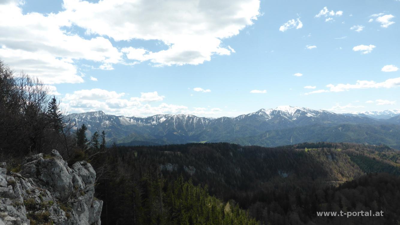 Heute geht es wieder einmal auf den Türnitzer Höger, dieses Mal wähle ich die Überschreitung von Furthof auf den Höger und weiter über Linsberg und Paulmauer Richtung St. Aegyd. Mein Fahrzeug stelle ich beim Bahnübergang in Furthof ab und folge der Asphaltstraße zu einem Bauernhof, wo aus ihr ein Forstweg wird. Entlang des Bachs geht es bis zum Parkplatz vor dem Schranken, für alle die nicht so weit gehen möchten. Nun noch ein Stück weiter und bald nach rechts zwischen den Felswänden hinauf. Nun geht es eine Zeit lang etwas steiler durch schönen Wald bergauf, mal werden die Pfade schmaler, mal breiter, Forststraßen werden gequert, bis irgendwann die steileren Wiesen mit vielen Baumstämmen auftauchen. Nur wenige Schneereste sind nach der Woche übrig geblieben und nach dem letzten Steilen Stück erreiche ich auch den Kreuzungspunkt für den späteren Rückweg. Nun ist es nicht mehr weit und der Ausblick vom Schneeberg bis zum Hochschwab wird frei, wenige Minuten später bin ich bei der Türnitzer Hütte.
