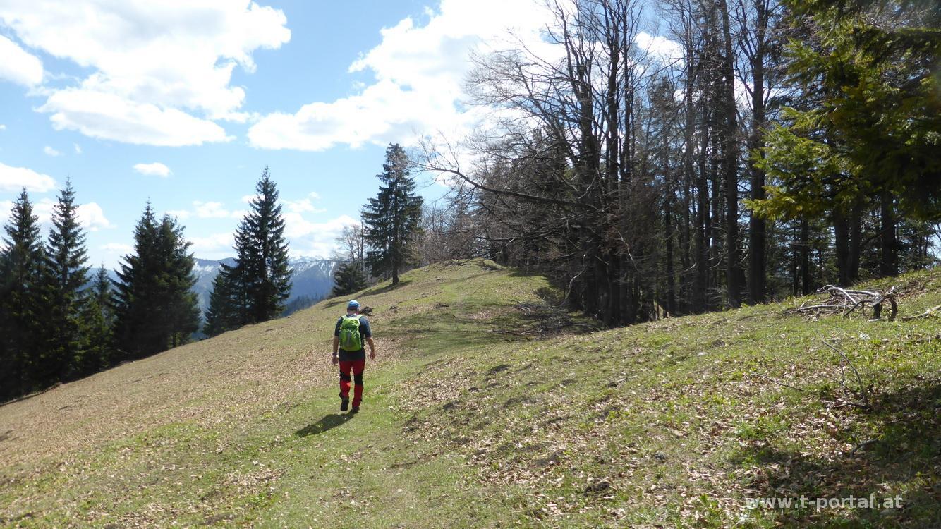 Hier treffe ich auf Robert Rosenkranz und seinen Bruder Ernst, die heute von Hohenberg über den Stadelbergkamm heraufgekommen sind. Nach Rastpause nehmen wir gemeinsam den weiteren Weg zur Paulmauer in Angriff. Nach dem Stück retour geht es auf rutschigen Pfaden hinab zur großen Wiese, von dort hinauf auf den Stadelberg, auf der anderen Seite wieder hinunter und oberhalb der Gschwendhütte vorbei. Es folgt der Anstieg zum Linsberg und erneute Abstieg entlang der Felswand. Zwischendurch ist auch schon das letzte Ziel - die Paulmauer in Sichtweite gerückt. Nach dem letzten Anstieg stehen wir zum Gipfelkreuz mit weiterhin toller Fernsicht.