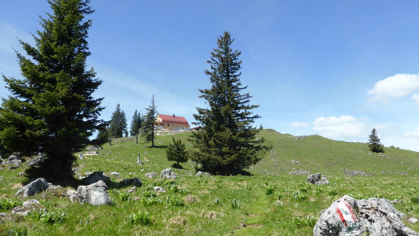 Nach der letzten Querung landen wir wieder auf der Forststraße, der wir ein gutes Stück bergan folgen. Wir treffen auf den Weg, der durchs Dachsental hinaufführt, wenden uns nach links uns steigen mit inzwischen tollem Panoramablick weiter auf. Weiter über Wiesen geht es ein Stück weiter und bald nach rechts etwas steiler hinauf, vorbei an ein paar Bäumen und Steinen, bevor das Annabergerhaus am Tirolerkogel zwischen den Bäumen hervorschaut. Einige Minuten Anstieg benötigen wir noch und dann sind wir auch schon fürs Gipfelfoto bereit. Erstaunlicherweiße hat die Hütte heute doch geöffnet, die Infos auf der Homepage und ein Anruf am Vortag haben das eigentlich verneint. Nach ausgiebiger Rast geht es über die Almen weiter Richtung Eibl. Zuerst meist abwärts, dann mit einigen Gegensteigungen folgen wir dem Pfad durch Wald und Wiesen, vorbei an der Bergrettungshütte, ein paar Kühen und alten Bäumen. So rückt irgendwann die bewaldete Südseite des Eiblgipfels ins Blickfeld. Für uns geht es noch ein Stück durch den Wald und dann auf der Forstraße zur Teichhütte, wo wir auf ein erfrischendes Getränk bei guter Sonne einkehren.