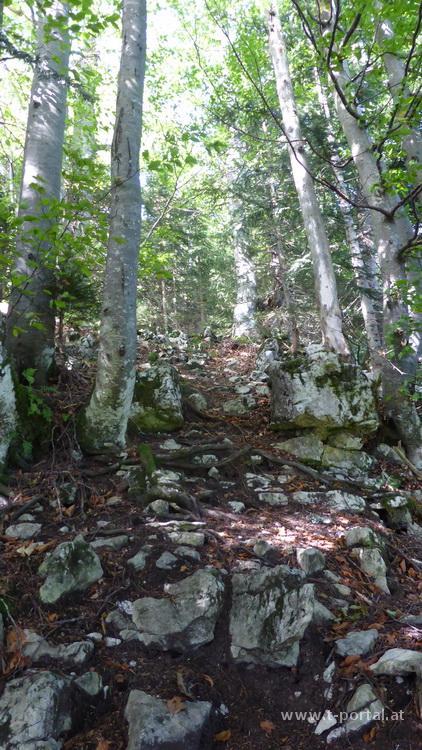 Der Abstieg wird dann etwas spannend. Zuerst folge ich dem vorhandenen Pfad - laut Wanderführer und GPS muss ich irgendwann nach links hinab. Der GPS Track ist jedoch nur nachgezeichnet und hilft mir nicht viel. Irgenwann erkenn ich Steigspuren im Steilhang und folge diesen hinab. Irgendwie verliere ich diese jedoch irgendwann und stehe im steilen Gelände herum. Nachdem ich keinen Pfad erkenne, steige und rutsche ich einfach direkt im Hang ab. Auf der Karte seh ich weiter unten eine Forststraße, diese möchte ich erreichen. Nach weiterem Abstieg treffe ich noch mal auf einen Pfad, dem ich ein Stück folge, als sich dieser wieder verzweigt steige ich zur Forststraße ab (der Pfad wär vermutlich der richtige gewesen). Der Forststraße folge ich zurück bis nach Puchenstuben. Eine sehr einsame und interessante Runde, im Nachhinein weiß ich auch, das ich grundsätzlich am richtigen Weg war, die Wegfindung war heute jedoch sehr schwierig.