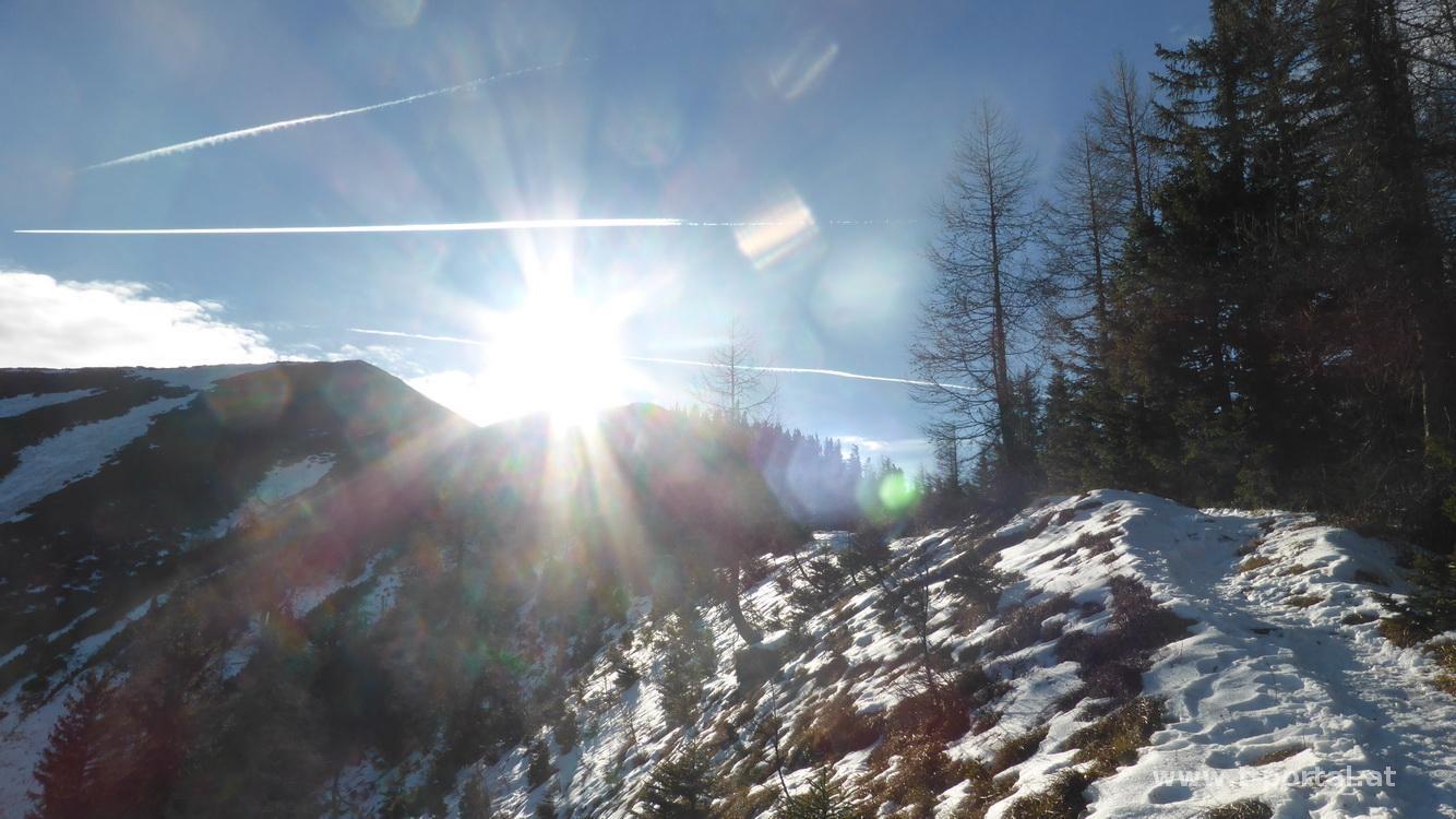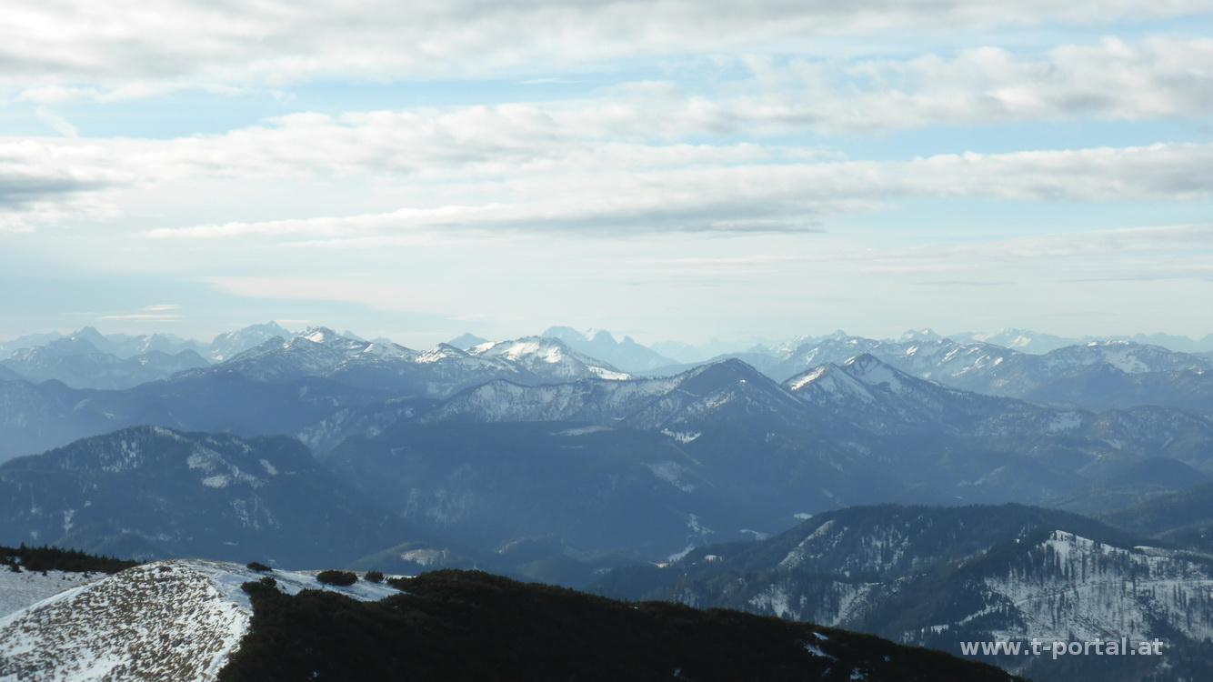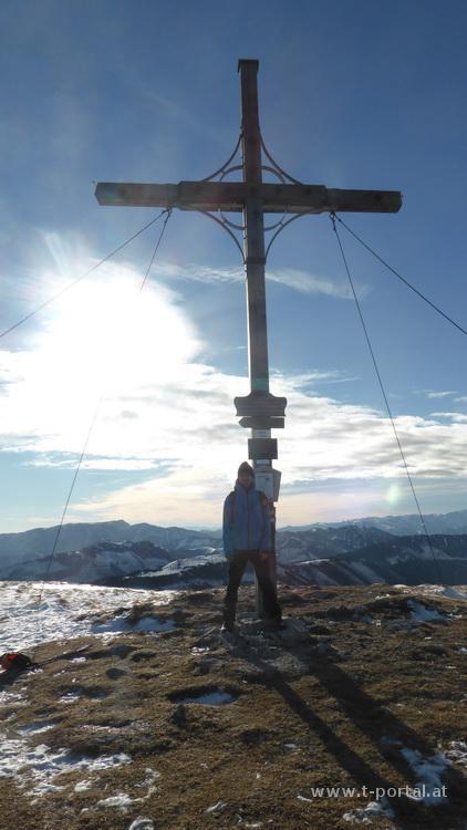 Nachdem es gestern so traumhaft schön war und ich heute frei habe, entschließe ich mich wieder mal den Göller zu besuchen. Als Route wähle ich die Kurzvariante vom Gscheid. Eigentlich hätte ich mir etwas Winterausrüstung mitgenommen, hier ist aber deutlich weniger Schnee als gestern, darum bleibt sie auch im Auto. Auf dem bekannten Weg folge ich den zahlreichen Spuren, gehe vorbei am Gsenger und immer dem Sonnenschein entgegen. Je weiter ich komme, umso mehr bläst der Wind. Der letzte steinige Anstieg ist auch bald geschafft und schon stehe ich beim Gipfelkreuz.