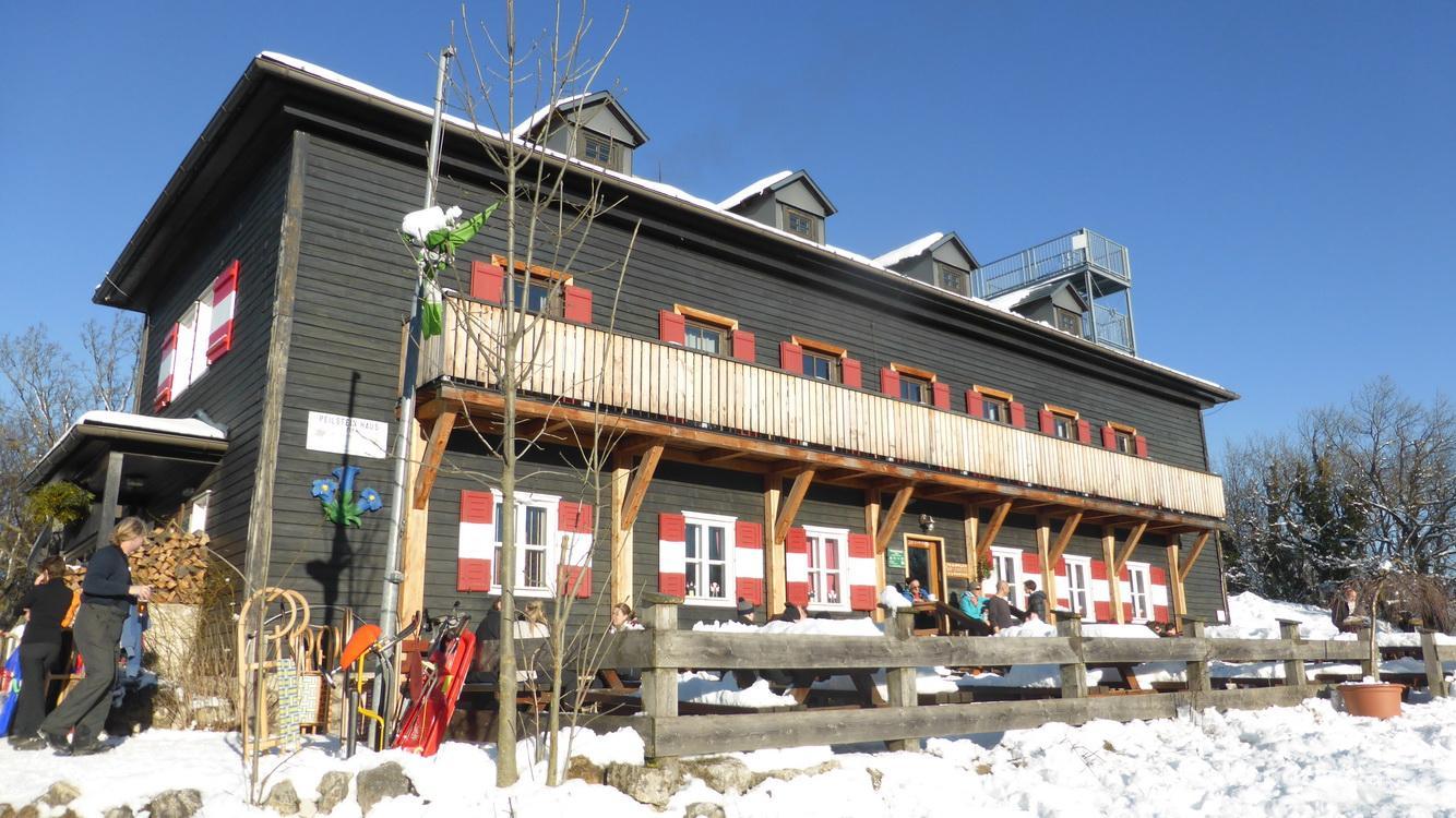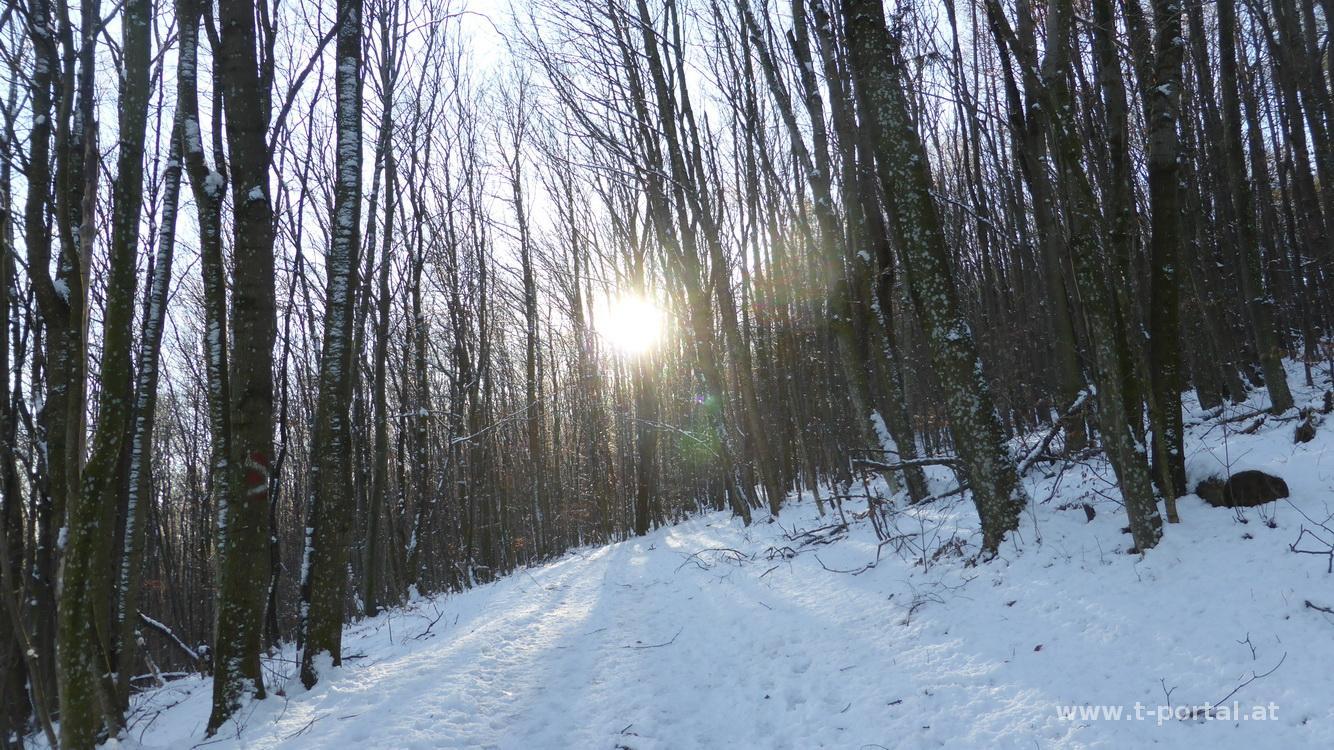 Auch für heute haben wir eine schnelle Tour gesucht, Klaudia stieß auf den Peilstein, also nichts wie hin. Wir starten in Maria Raisenmarkt und folgen ein Stück der Straße, bevor es in den Wald geht. Noch geht es wenig bergauf, bis wir nach links hinauf zur Ruine Arnstein abbiegen. Im Wienerwald liegt heute wesentlich mehr Schnee als die letzten Tage in anderen Gegenden, die wir so passiert haben. Auf dem Wanderweg geht es durch den Schnee gemütlich dahin, bis wir das Peilsteinhaus erreichen. Hier rodeln zahlreiche Kinder und Erwachsene die Straße entlang.