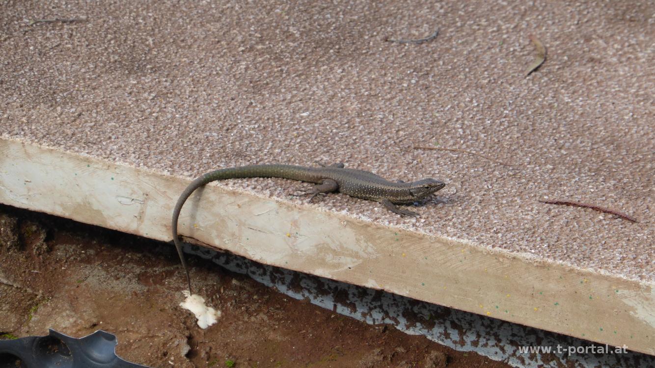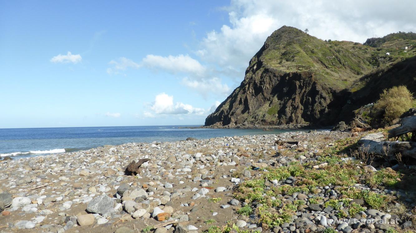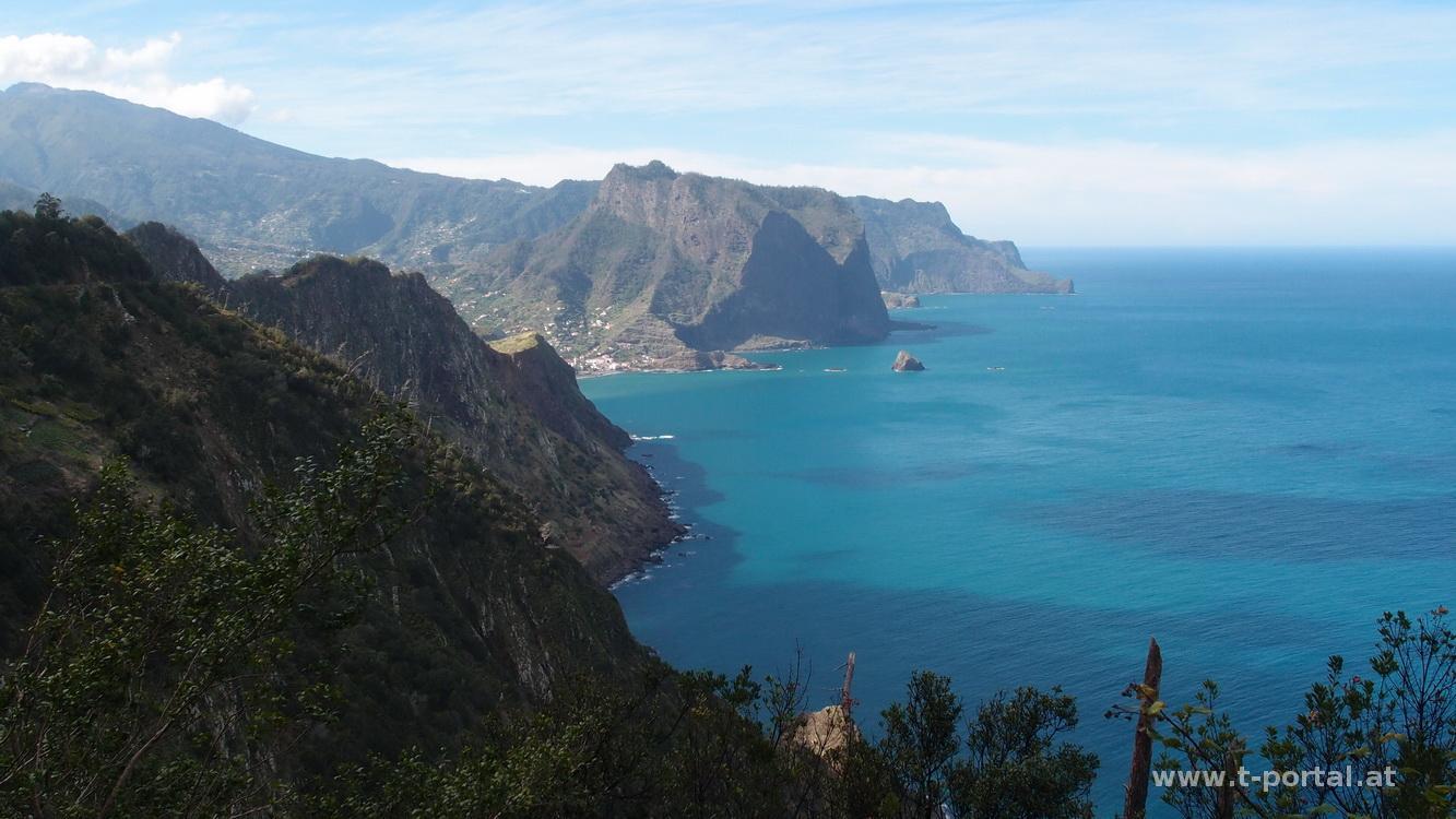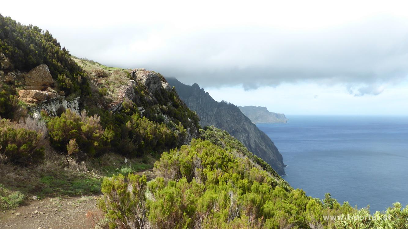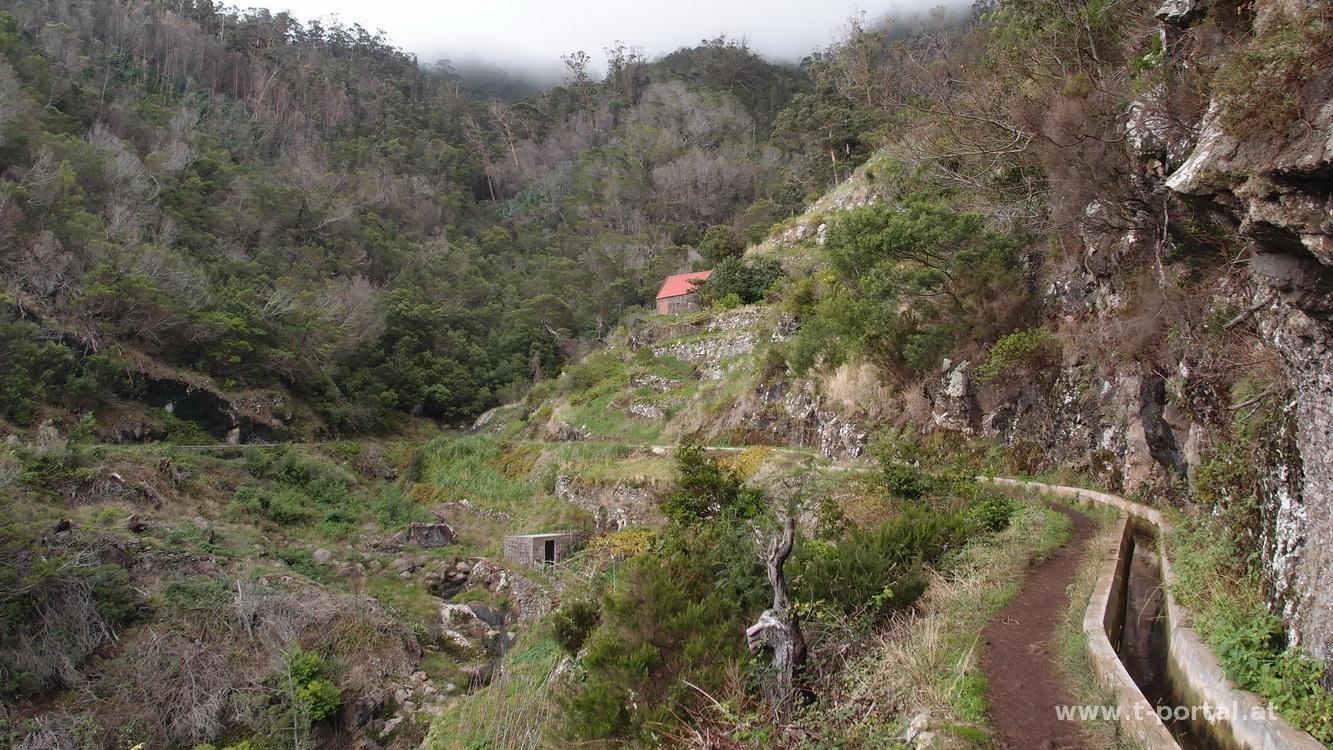 Auf zumeist gesicherten Pfaden geht es etwas auf und ab, laut Wanderführer zwar schwarz markiert, für uns aber nicht wirklich schlimm, auch wenn es neben uns oft weit in die Tiefe geht. An zahlreichen Stellen rinnt Wasser über die Wände, Blumen und Gestrüpp schießt überall aus Wänden und dem Boden. Wir pausieren zwischendurch, bevor wir durch gut riechenden Lorbeerwald weiterwandern. Nach weiteren Wasserüberschreitungen wir der Weg breiter und wir erreichen bald die niemals eröffnete Gondelbahn und wenig später Larano. Durch den Ort geht es nun hinunter zur Küste und weiter nach Porto da Cruz.