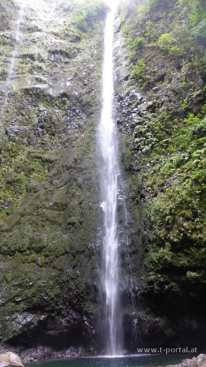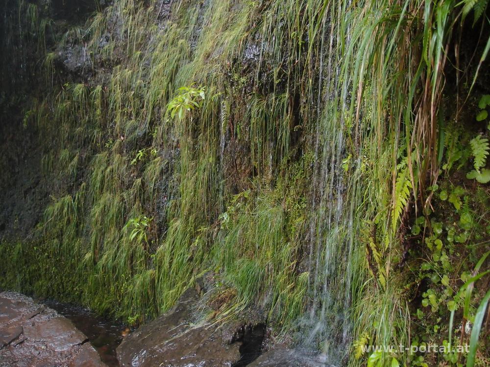 Wir kommen gut voran, durchqueren die ersten Tunnel und erreichen so irgendwann den schönen Wasserfall am Ende der Kessels Caldeirão Verde. Hier pausieren und fotografieren wir etwas, bevor wir uns auf den Weg zum Caldeirão de Inferno machen. Leider ist es schon etwas spät, darum ziehen wir das Tempo nochmal an. Zuerst geht es noch flach dahin, dann folgt der Anstieg über einige Treppen, bis wir vor einer Tunnelabzweigung stehen. Hier geht es nach rechts, vorbei an einem Wasserbecken und Wasserfall. Es folgen weitere Tunnel, die am Ende auch nicht mehr sehr hoch sind.