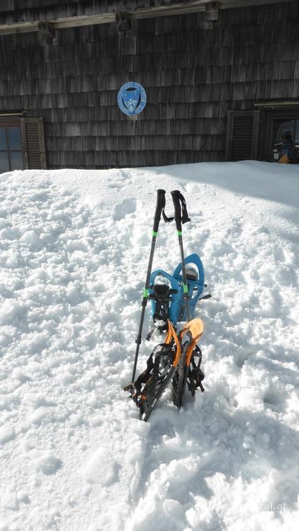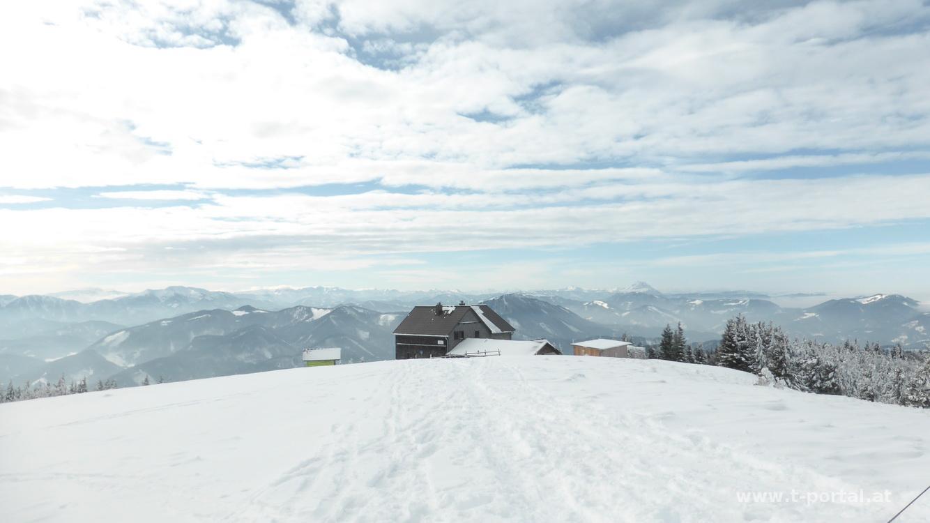 Heute packen wir die Schneeschuhe aus und wandern auf die Reisalpe. Los geht es auf der Ebenwaldhöhe, wo wir auch gleich die Ausrüstung an die Schuhe packen. Bald haben wir Ausblick zum Hochstaff und zur Reisalpe. Die Sonne versteckt sich noch hinter den Wolken und so wandern wir entlang der Forststraße zuerst ein Stück hinab und dann eher flach dahin zur Kleinzeller Hinteralm. Wir folgen den Spuren rechts an der Almhütte vorbei über den Schnee bergauf. Die Unterlage ist mit einer Eisschicht überzogen, die immer wieder etwas bricht. Nach Querung der Wiese lassen wir ein paar Skitourengeher vorbei, steigen über den Zaun und watscheln durch die Baumgasse weiter hinauf. Es wird etwas steiler und die Steighilfe wird langsam nützlich. Nochmal eine engere Waldpassage, dann geht es über die steile Wiese hinauf, teilweise nehmen wir die direkte Variante, dann queren wir auch wieder Mal und erreichen so bald das Gipfelplateau.