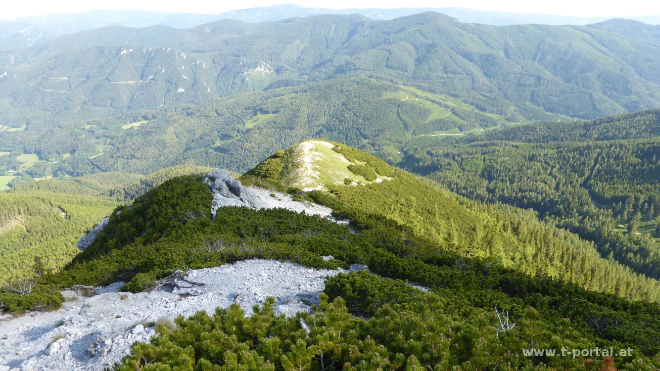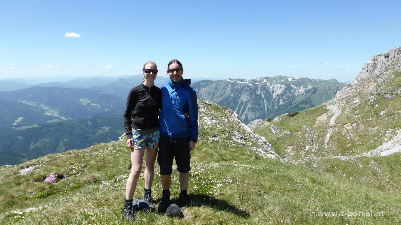Über lockere Erde und ein paar Steine geht es nun steiler aufwärts, ein paar Mal müssen die Hände zur Hilfe genommen werden. Bald folgt die Schlüsselstelle in der es ein paar Meter nach oben geht. Mit dem richtigen Griff und Tritt aber kein Problem. Es folgt noch ein steiniger Anstieg und schon sind die schlimmeren Stellen am Steig überwunden. Wir posen etwas mit Schneealpenblick, schauen beim nächsten Schneefeld vorbei und machen uns dann auf den letzten Anstieg zum Gipfel. Hier verdrücken wir unsere wohl verdiente Jause, bevor es hinab Richtung Gamseck und weiter zum Habsburghaus geht. Hierzu steigen wir durch die Grasbodenalm bis zum Bärenloch ab, um auf der anderen Seite durch die Latschen wieder rauf zu watscheln.