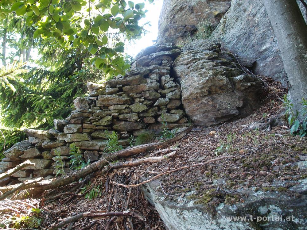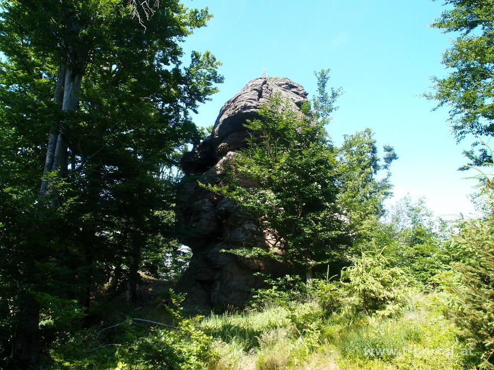 Nach Besteigung des Gipfels geht es noch ein Stück weiter zum Mühlberg (höchste Erhebung im Dunkelsteinerwald) und quer durch den Wald zum Friedrichsfelsen mit der Steintreppe davor. Eine Besteigung schaut mich nicht ganz so einfach an, schauen wir uns das von unten an und rasten hier kurz. Nachdem wir uns nicht quer durch das Gestrüpp bahnen wollen, geht es am gleichen Weg wieder retour.