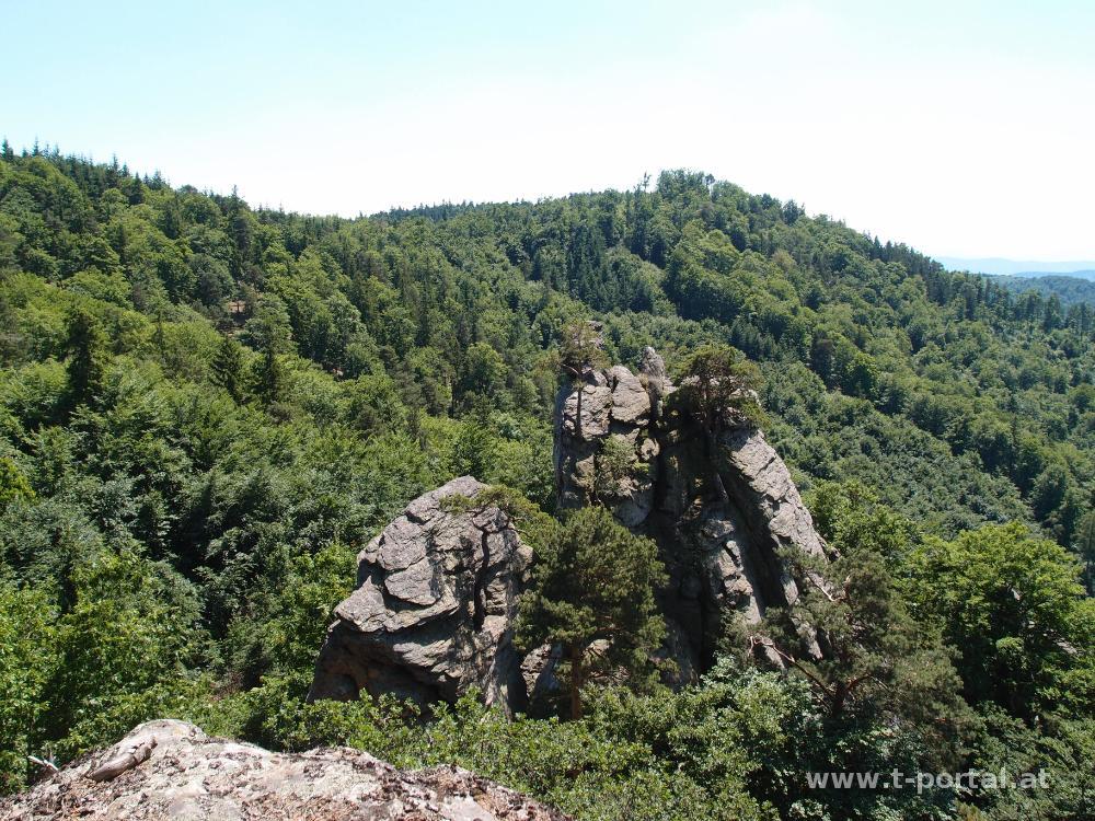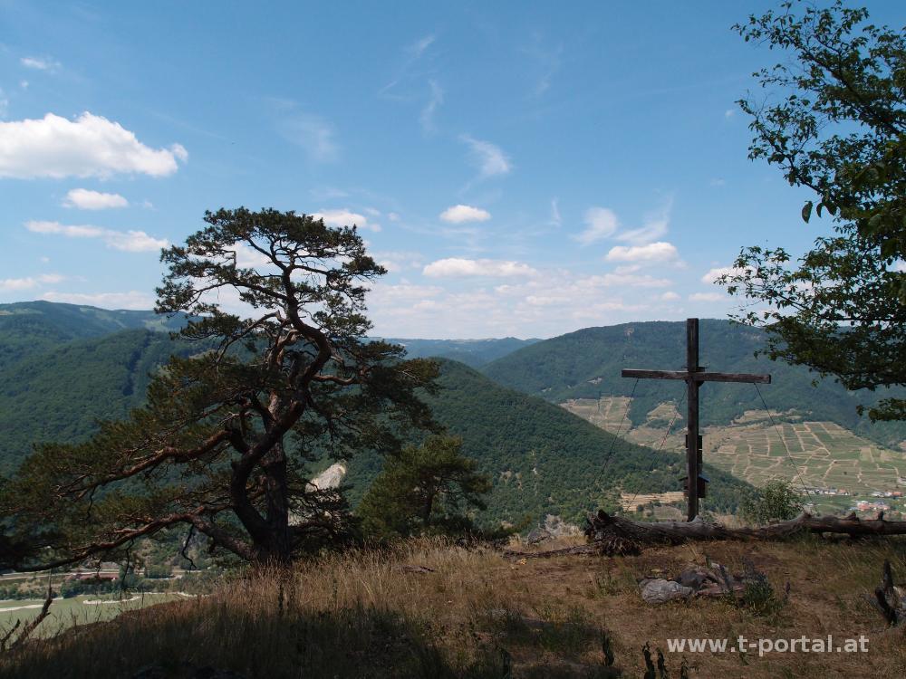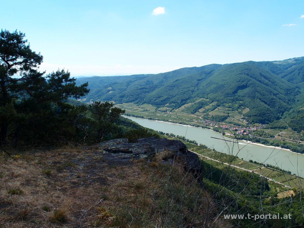 Von der roten Wand haben wir tollen Ausblick runter zur Donau, nach Spitz, zum Jauerling und westwärts bis zum Ötscher. Nach kurzer Pause geht es zuerst ein Stück retour und dann der Straße folgend weiter bis zum Abzweiger zum Hohen Stein. Nun wieder steiler aufwärts zu den Felsformationen. Die höchste davon (der Hohe Stein) kann über einen kurzen Klettersteig mit Leitern und Stahlseil erklommen werden. Die nebenliegenden sind eher den Kletterern vorbehalten.