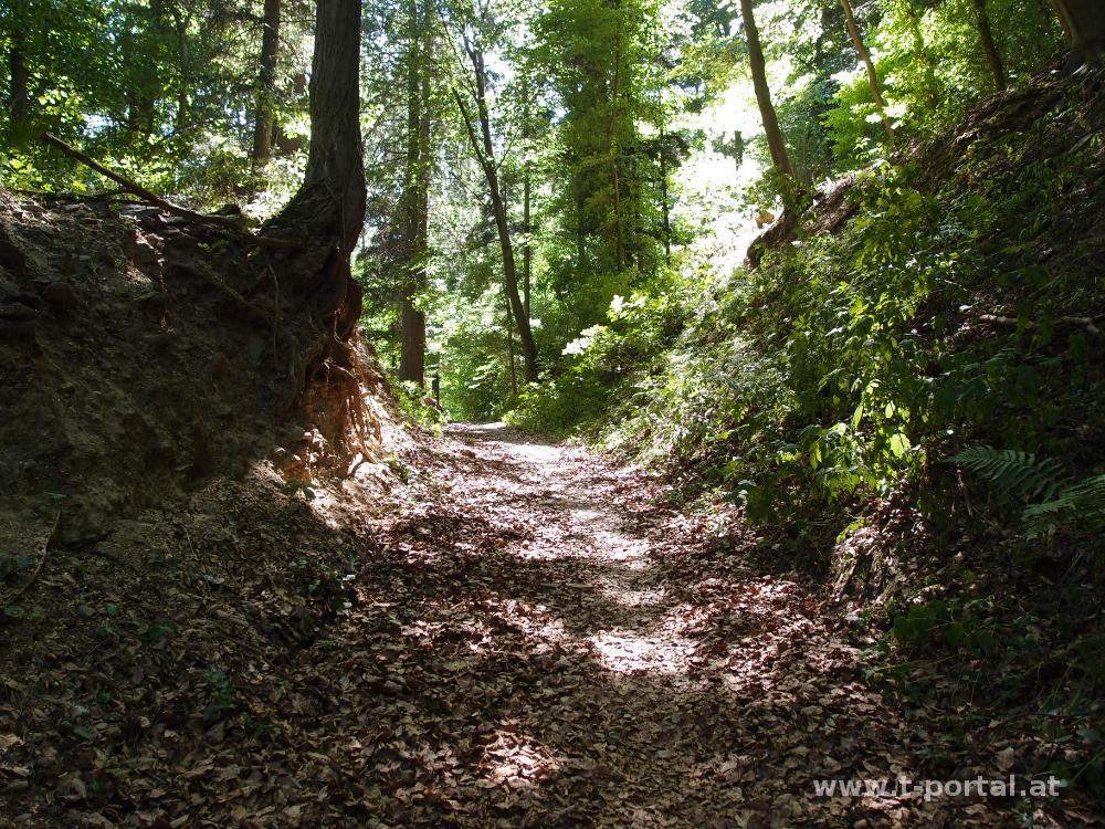 Die Sonne scheint, wir haben aber heute nicht so viel Zeit, darum geht es auf eine kürzere Runde in die Wachau. Wir parken uns an der B33 zwischen den Arnsdörfern in der Nähe der Rollfähre nach Spitz ein und wandern ein Stück die Straße entlang zu einem Marterl. Durch die Weinreben geht es dann auf den eigentlichen Wanderweg Richtung Rote Wand und Hoher Stein. Bald ist Schatten erreicht und so geht es zumindest etwas kühler durch das Buchental aufwärts. Mit leichtem Brennnesselkontakt erreichen wir die Kreuzung, wo wir nach rechts zur roten Wand abbiegen. Auf der Forststraße geht es in leichtem auf und ab zu unserem ersten Ziel.