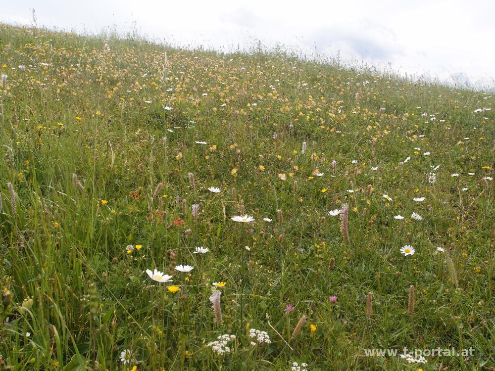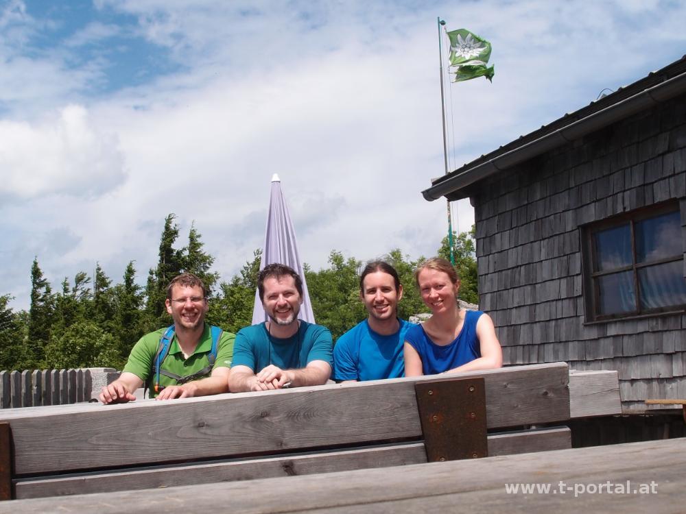 Auf der schönen Blumenwiese bläst uns ordentlich der Wind entgegen, darum geht es auch gleich runter zum Himmelbauer, einmal durch die Kuhherde und auf der Forststraße zu unserem eigentlichen Ziel weiter. Bald geht es nach links über die Wiese und auf Waldpfaden weiter. Es folgen An- und Abstiege durch Wald und Blumenwiesen bis wir auf der Forststraße stehen, die uns zum Engleitensattel führt. Auf gut bekanntem Weg folgt der letzte Anstieg zum Ziel. Durch den Regen ist es stellenweise etwas feucht, aber doch gut zu gehen. Auch die Sonne zeigt sich nun immer wieder zwischen den Wolken. Nachdem der Hunger schon groß ist, strengen wir uns nochmal an und erreichen bald das Otto Kandler Haus am Hohenstein.