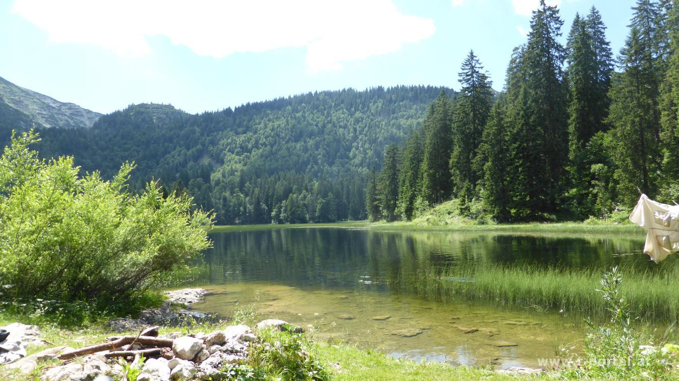 Oben angekommen werden wir mit schöner Aussicht belohnt, die wir ausgiebig genießen. Danach geht es wieder ab in die Latschen und über Steine und Kuhfladen hinab. Nach längerem Abstieg erreichen wir die Herrenalm, blicken hinab zur Almhütte und das Leonhardikreuz. Von hier geht es recht flott über rutschige Erdpfade hinab zum Obersee. Die Vegetation hat hier wieder zugeschlagen und wuchert fröhlich vor sich hin. Am See angekommen testen wir kurz die Wassertemperatur und sind wenig später auch schon im Wasser. Flach schwimmen ist angesagt, denn nur die obere Schicht hat (für mich taugliche) Schwimmtemperatur. In der Sonne lässt es sich anschließend gut trocknen und jausnen. Dabei schauen wir vielen blauen Libellen und dem Entennachwuchs zu.