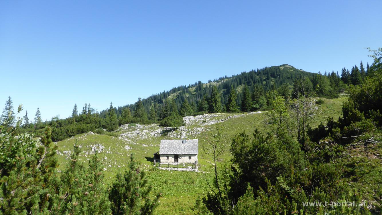 Der zweite Tag unserer Dürrensteinüberschreitung startet mit einem gemütlichen Frühstück in der Ybbstaler Hütte. Anschließend packen wir unseren sieben Sachen und machen uns im Sonnenschein auf den Weg zum Gipfel des Dürrensteins. Zuerst geht es noch etwas flacher durch Wald und entlang eines Schotterwegs zur Legsteinalm und zur zugehörigen Quelle. Anschließend neben vielen Blumen durch die Latschen weiter gemütlich aufwärts. Vorbei geht es am Kuhgeläut zwischen den Latschen und haufenweise Karstfelsen dem Ziel entgegen. Weiter oben sehen wir ein Rudel Gämsen, das nicht sonderlich geschreckt ist. Bald stehen wir vor dem nächsten Wegweiser und nehmen den letzten Anstieg zum Gipfel im Angriff.