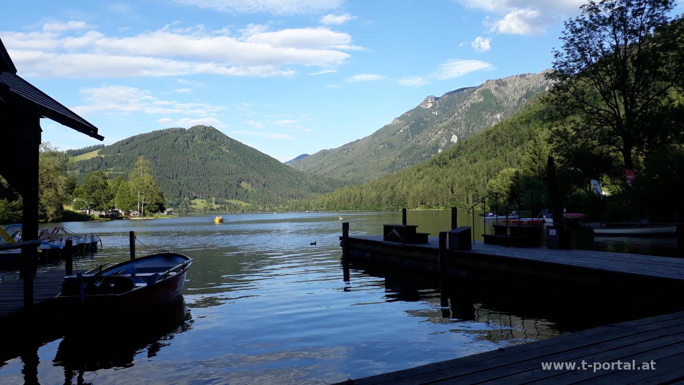 Es folgt der eher unspektakuläre Abstieg entlang der Forststraße zum Lunzer See. Hierbei bewundern wir unterwegs den brüllenden Stier (unterirdischer Wasserfall), den großen Wasserfall schauen wir uns von der Nähe an und wandern am Mittersee vorbei. Unten kann noch ein Stück des Straßenpfad abgekürzt werden, bevor wir vorbei am Seehof den Lunzer See erreichen. Am Südufer marschieren wir nun Richtung Zentrum, wobei wir unterwegs natürlich nochmal die Füße ins Wasser halten. Bei der Seeterrasse gibt es noch ein Eis zur Stärkung, bevor wir den Anstieg zum Seekopf in Angriff nehmen. Etwa zweihundert Höhenmeter geht es nochmal hinauf, dann entlang einer Forststraße vorbei an wartenden Kühen und neben ein paar älteren Haus-Kästen wieder hinab nach Kasten, wo wunderbare zwei Wandertage zu Ende gehen.