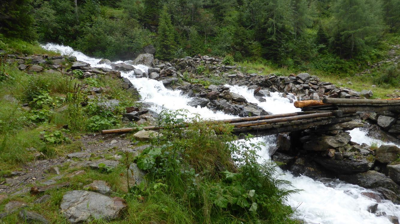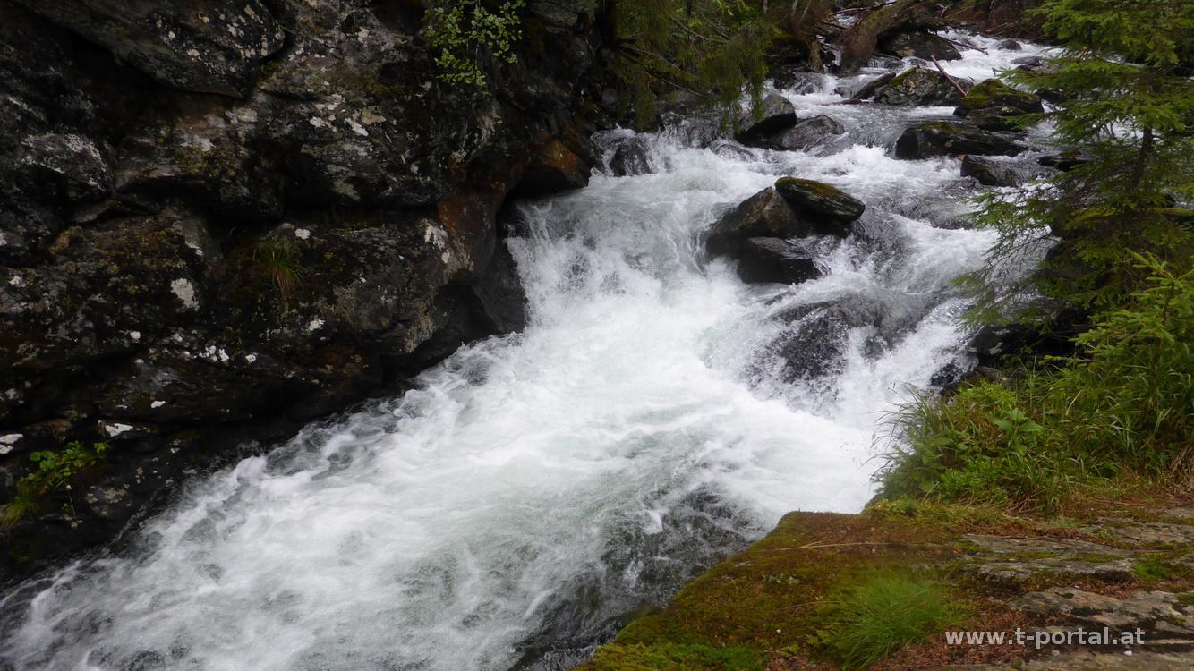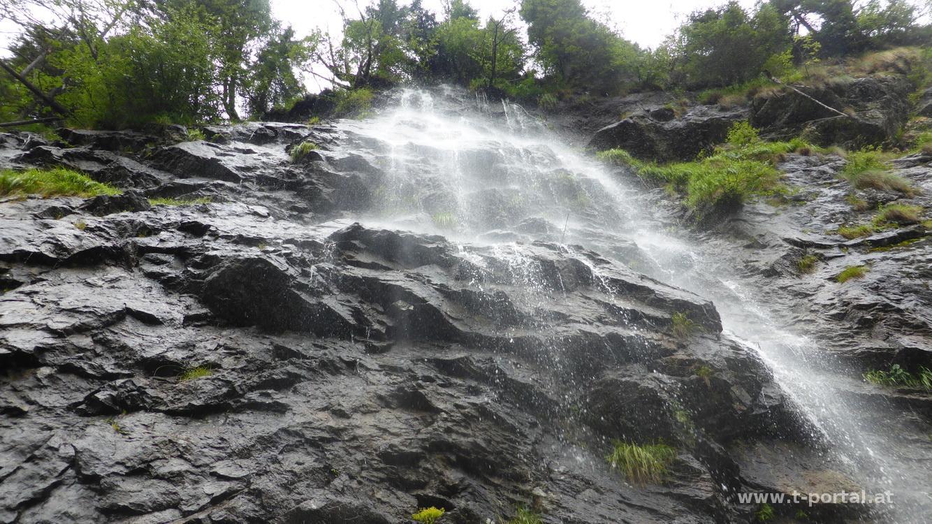Wir stecken uns in die Regenklamotten und machen uns über den feuchten Weg an den Abstieg. Bald queren wir den rauschenden Bachlauf und gehen immer weiter hinab, bis wir die Straße erreichen. Vorbei an einigen Almen wandern wir im Regen zum Riesachsee. Neben uns stürzen zahlreiche Wasserfälle ins Tal, was zumindest für schöne Ausblicke und gute Bilder sorgt.