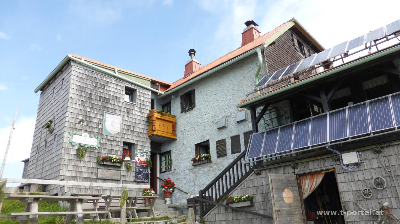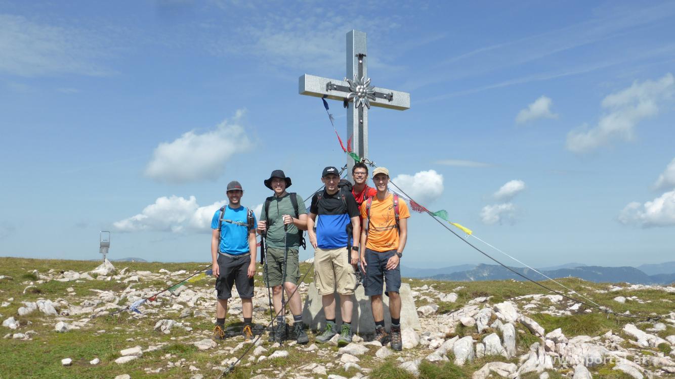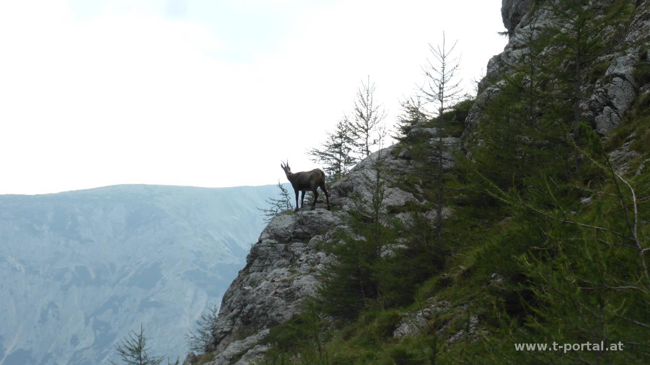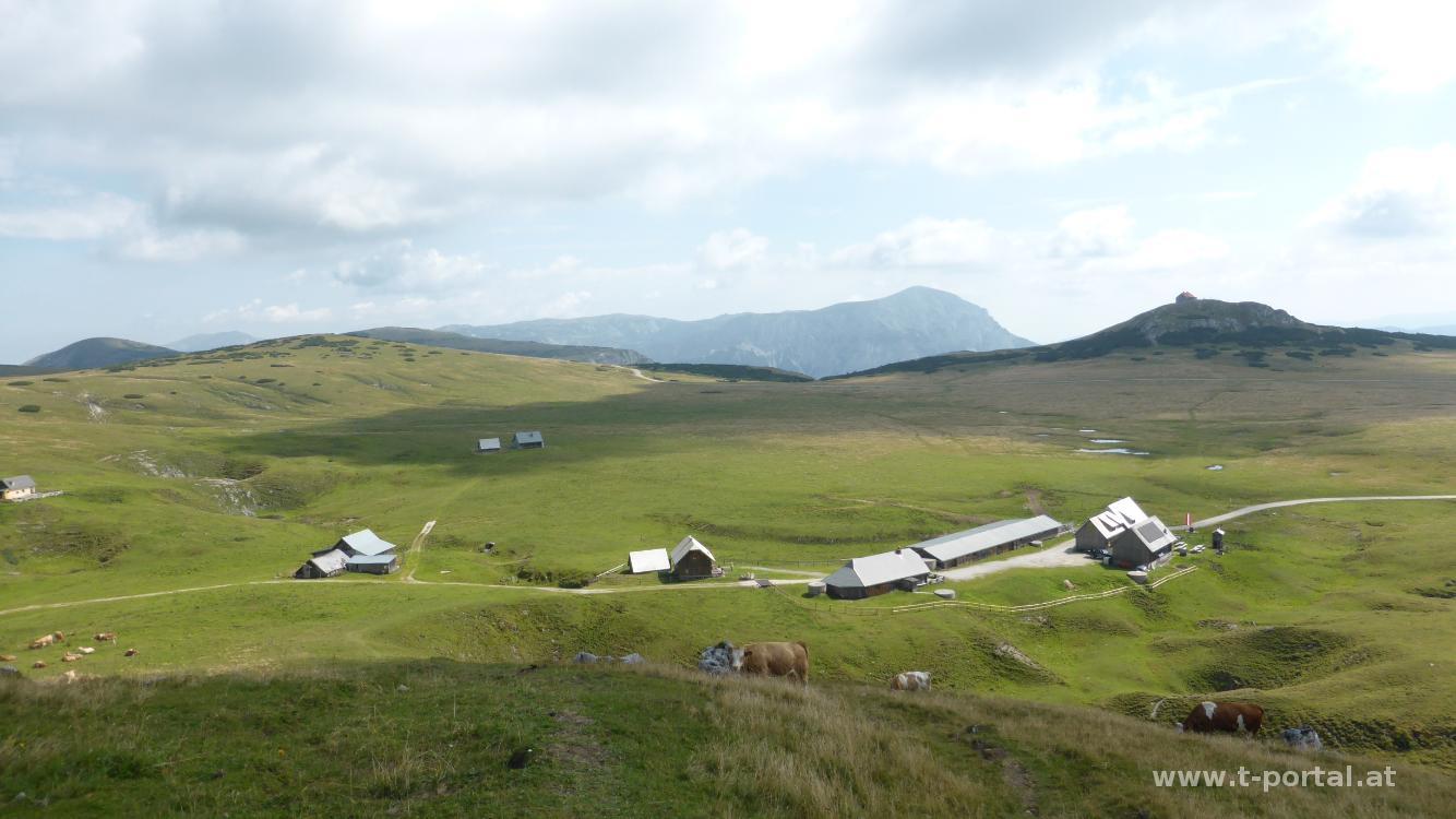 Nun wird es etwas steiler und wir bewundern eine Gämse, die hier viel schneller über die Steine hüpft, als wir. Für uns geht es über einen Holzsteg und eine Leiter weiter hinauf. Nach weiterem Anstieg über Stein und Erde erreichen wir durch einen Graben das Plateau der Schneealpe. Dort blicken wir zu unserem Ziel der Runde: dem Windberg. Vorher statten wir aber noch dem Schneealpenhaus einen Besuch ab. Nachdem wir verhindet haben, dass der Hüttenhund unsere Jause vernichtet, wandern wir übers Plateau, vorbei an der Michelbauernhütte und durch eine Kuhherde dem Gipfel entgegen. Dort sind wir auch bald angekommen und genießen das Panorama. Ausnahmsweise ist es hier nicht elendig windig.