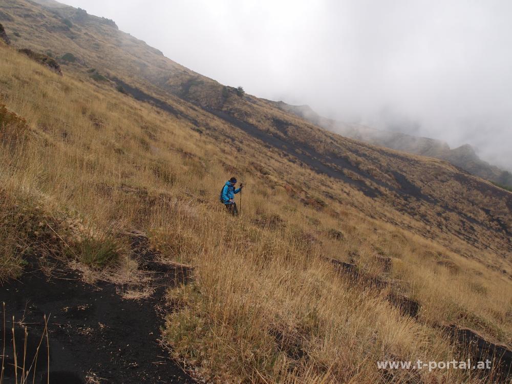 Von hier hat man Ausblick über das ganze Tal und zum Etna, der sich aber gerade hinter den Wolken versteckt. Nun geht es ein Stück am Kamm weiter, etwas auf und wieder ab, bis zu einem Sattel. Am Weg ziehen immer wieder Nebelschwaden durch und eigentlich schaut es etwas nach Regen aus. Vom Sattel folgt der steile Anstieg hinauf zu einigen Messstationen und zum höchsten Punkt unserer Tour. Dort rasten wir etwas, bevor es nach rechts hinunter ins Valle del Bove geht. Wir rutschen, so gut es geht, die Ascherinnen hinunter. Mit etwas Weitblick findet man auch immer wieder lässige Abfahrtsmöglichkeiten - so wie Schneeschuhen - nur auf Asche.