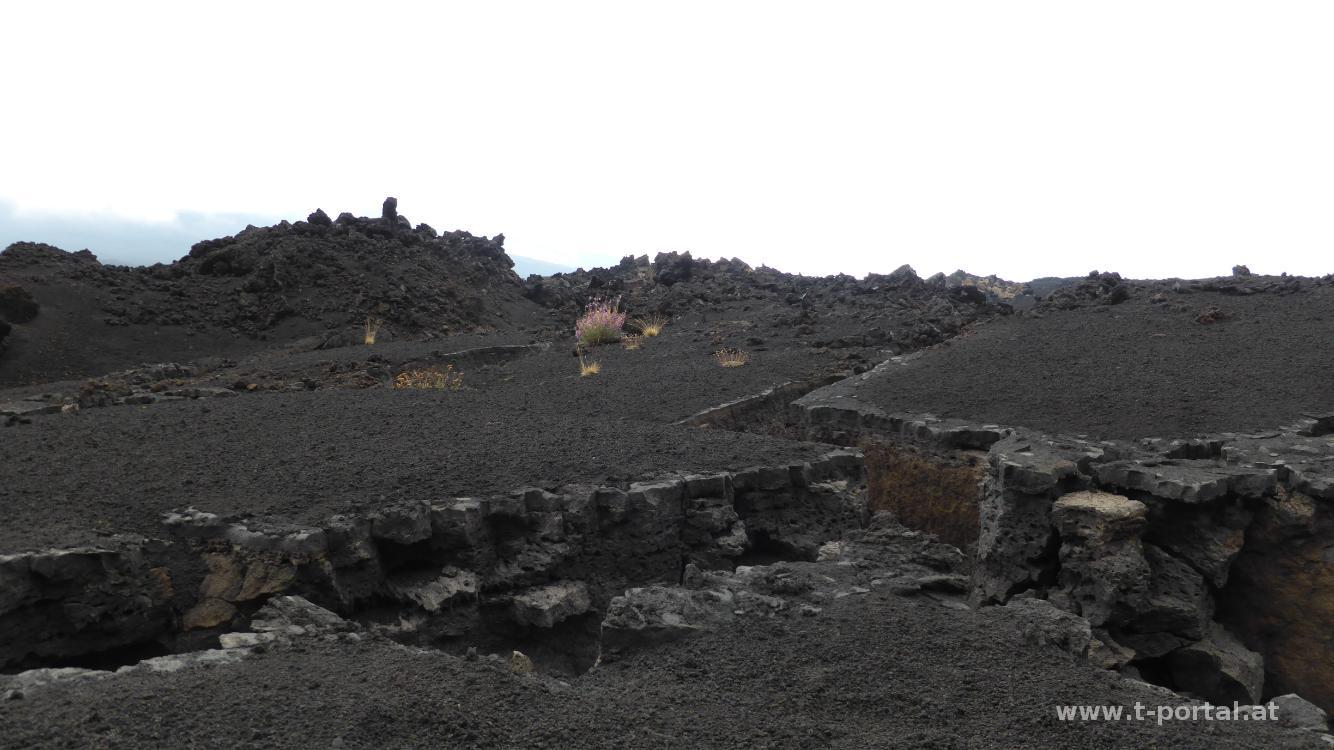 Unten angekommen wird das Ausmaß des Valle erst wirklich ersichtlich. Die Lavaplatten türmen sich und wir steigen über so manchen Riss im Lavameer. Zwischendurch wird das Wetter wieder besser und gibt den Blick auf die Hänge des Etna frei. Der schwach ausgeprägte Weg folgt dem rechten Rand des Lavafeldes und ist spärlich mit orangen Punkten markiert. Kurz vor dem Ende unseres Valle Abstechers tröpfelt es ein wenig. Nun geht es wieder rechts hoch und zurück auf den bekannten Pfad. Diesem folgen wir wieder hinauf zum Monte Zoccolaro und zurück zum Ausgangspunkt. Schöne Tour und beeindruckende Gegend. Anschließend sind wir noch etwas am Etna herumgekurvt.