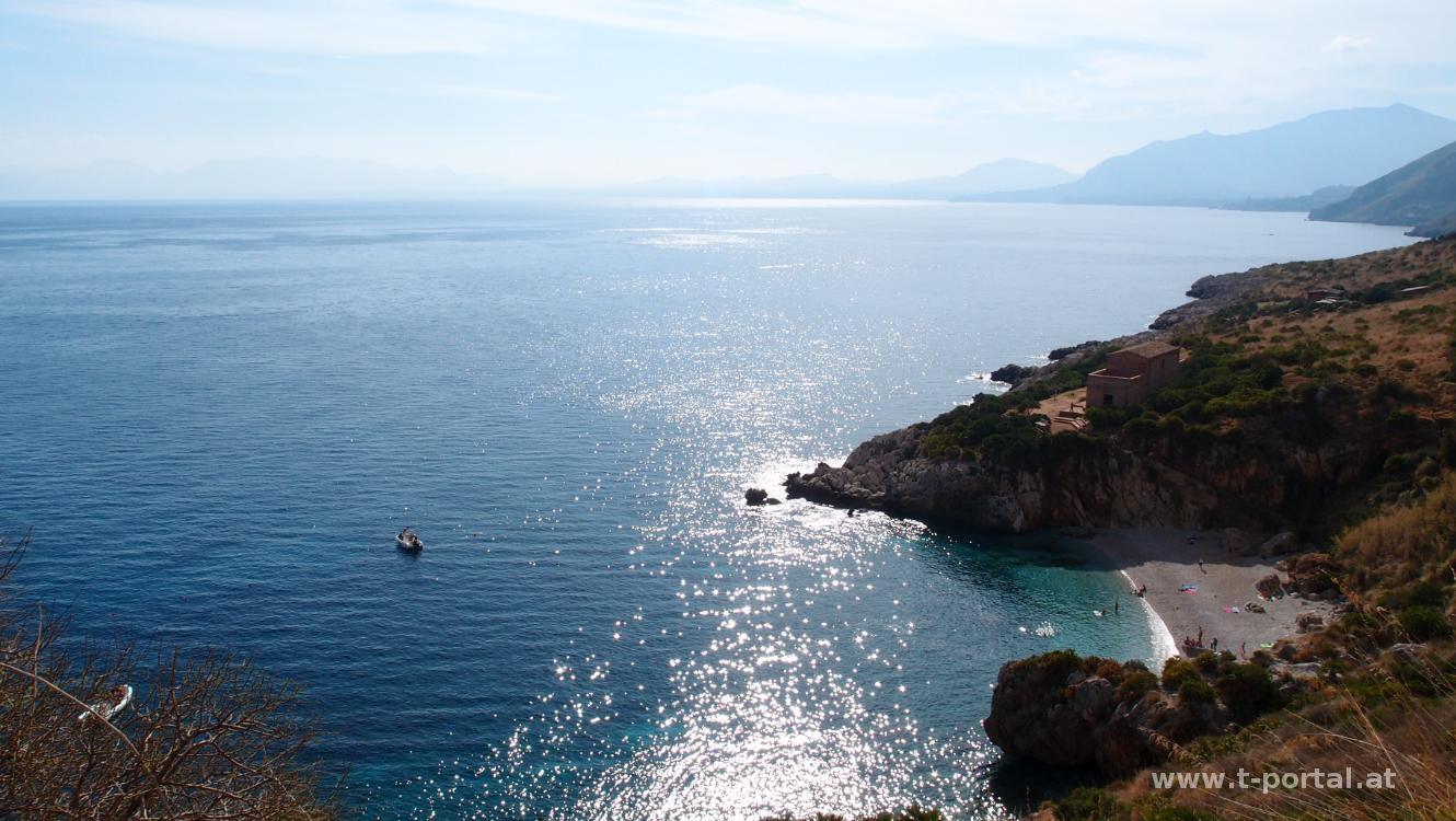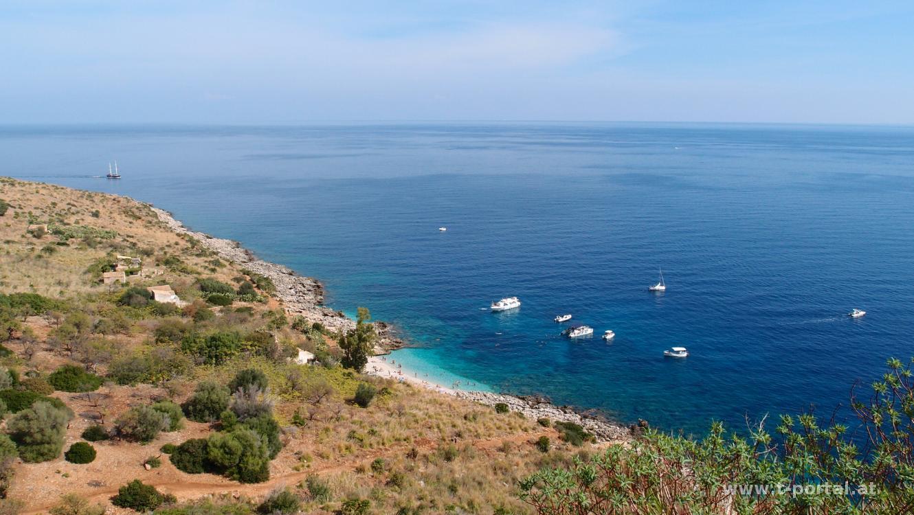 Anschließend geht es durch mehr bewachsenes Gebiet weiter, wobei rund um uns ein paar Eulen aufsteigen. Fasziniert wandern wir weiter und steigen bald zum nächsten Steinhaus ab, folgen kurz einer Straße und gehen dann in vielen Kehren hinab zum Nationalpark-Info-Haus am Südeingang des Parks. Weiter geht es ein gutes Stück über der Küste bis wir zur Cala dell'Disa absteigen und eine Runde schwimmen und Fische schauen gehen. Nach ausreichender Trockenphase wandern wir wieder hinauf auf den Pfad und mit einem Abstecher zur Cala dell'Uzzo zurück zum Eingang des Nationalparks.