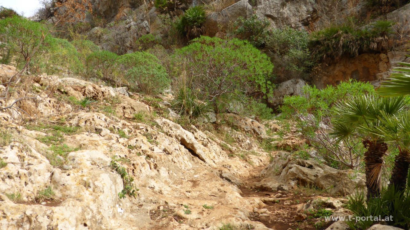 Die heutige Wanderung soll uns auf den Monte Cófano führen. Nach der Anreise entlang des Strands parken wir am Parkplatz neben dem Informations- und Ticketschalter. Dort versucht uns der Local Guide auf italienisch zu erklären, dass aufgrund von Felssturz der Aufstieg nicht möglich ist. Viel mehr verstehen wir nicht, also entschließen wir uns, zumindest einmal rund um den Berg zu gehen. Zusätzlich tauchen am Horizont schon Regenwolken auf, was für eine kurze Tour spricht. Wir wandern also ein Stück die Straße entlang und biegen dann nach links ab und steuern auf die Felswand zu. Kurz vor dem Wandfuß wenden wir uns nach rechts und steigen in einer Schlucht auf.