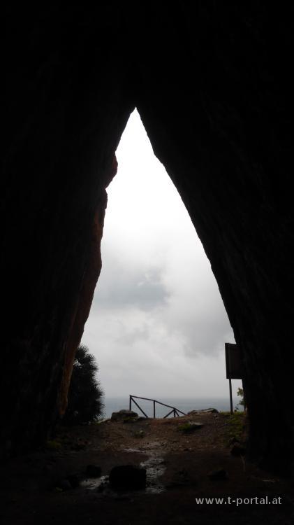 Rasch gewinnen wir an Höhe und gehen anschließend flacher bis zum Sattel, bei dem man zum Gipfel abzweigen könnte. Wir sehen auch auf die andere Seite und dem nahenden Wetter ins Auge, entschließen uns aber noch weiter zu gehen. Hinter uns treibt ein Hirte mit lauten Schreien seine Kuhherde durch die Landschaft, darum flüchten wir schnell Richtung Meer. Links von uns können wir einen Steinbruch bewundern, während über den Monte Cófano der Wind pfeift und damit einen lustigen Singsang erzeugt. Nach dem Abstieg durch Fels geht es über eine Wiese und anschließend etwas oberhalb der Küstenlinie Richtung Norden. Bald taucht vor uns der Turm vom Torre di San Giovanni auf. Wenig später holt uns der Regen ein. Somit beschleunigen wir und erreichen die Grotta Crocifisso, wo wir uns unterstellen und jausnenderweise den Großteil des Regenschauers und der Blitze abwarten.