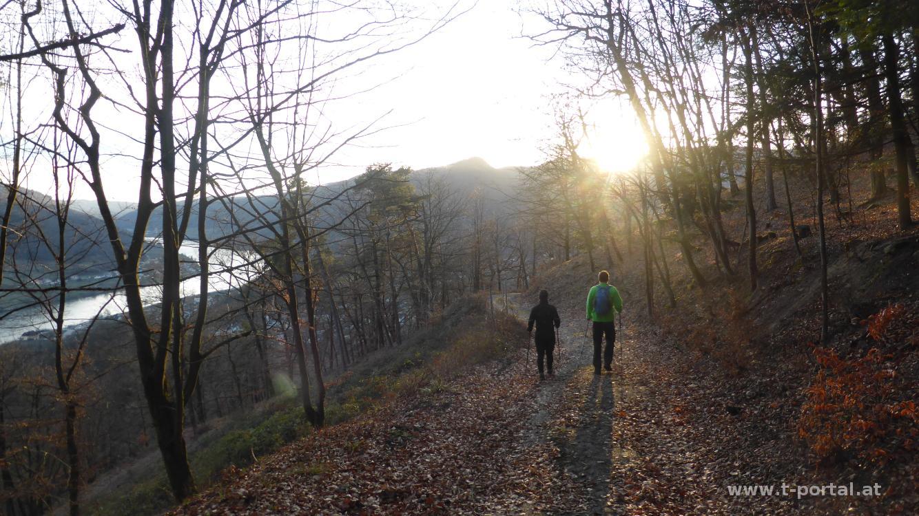 Wie schon letztes Jahr wollen wir auch dieses Jahr vor der Silvesterfeier eine Runde durch die Wachau wandern. Nachdem überraschenderweise doch die Sonne scheint, entschließen wir uns für die Sonnenseite und gehen wieder auf die Buschandlwand (anstelle des Seekopfs). Auch dieses Jahr sind Klaus, Stefan, Klaudia und meine Wenigkeit unterwegs. Wir starten in St. Michael bei der Kirche, gehen kurz durch den Ort und über die Bahntrasse. Von dort beginnt der Anstieg durch den schattigen und feuchten Wald. Wenig später sind wir aber schon wieder in der Sonne unterwegs. Im Hang geht es immer wieder etwas auf und ab. Zuerst wandeln wir auf schmaleren Pfaden danach folgen wieder Forstwege. Durch das viele Laub fühlt sich die Tour wie eine Herbstwanderung an. Vor der erste Kehre Richtung Buschandlwand sehen wir noch eine Quadcopter-Drohne an einem Baum hängen. Hier führt uns der Pfad weiter nach Norden und bald geht es etwas steiler hinauf zu unserem Ziel, das wir auch bald erreichen.