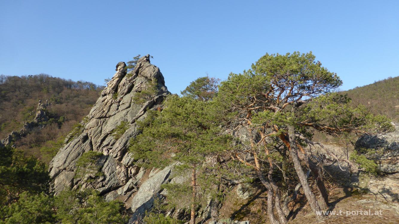 Die heutige Runde führt uns in die Wachau. Wir parken etwas außerhalb von Dürnstein und wandern vorbei am Bahnhof zum Kuhberg. Dann geht es mit kurzen Steigeinlagen hinauf. Vorbei an zahlreichen Felsen haben wir schönen Ausblick zur Ruine und zu den Kletterfelsen. Bei der Fesslhütte sind sie gerade komplett überfordert, so jausnen wir unsere mitgebrachten Schnitten in der Nähe des höchsten Punkt des Vogelbergsteigs.