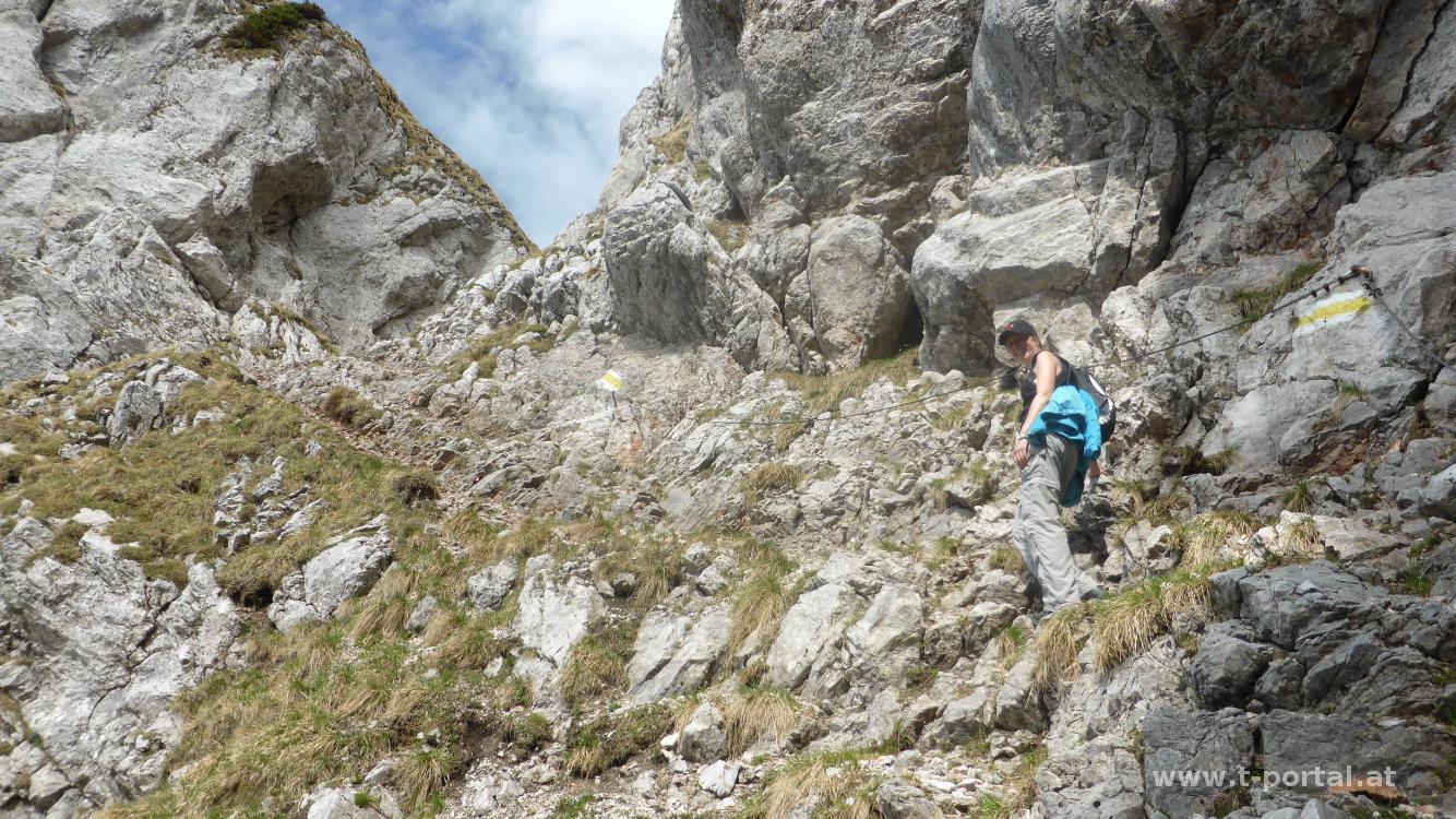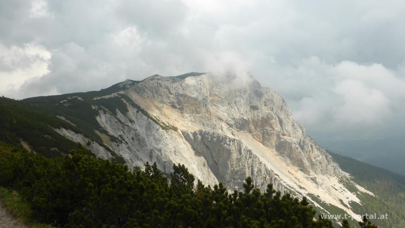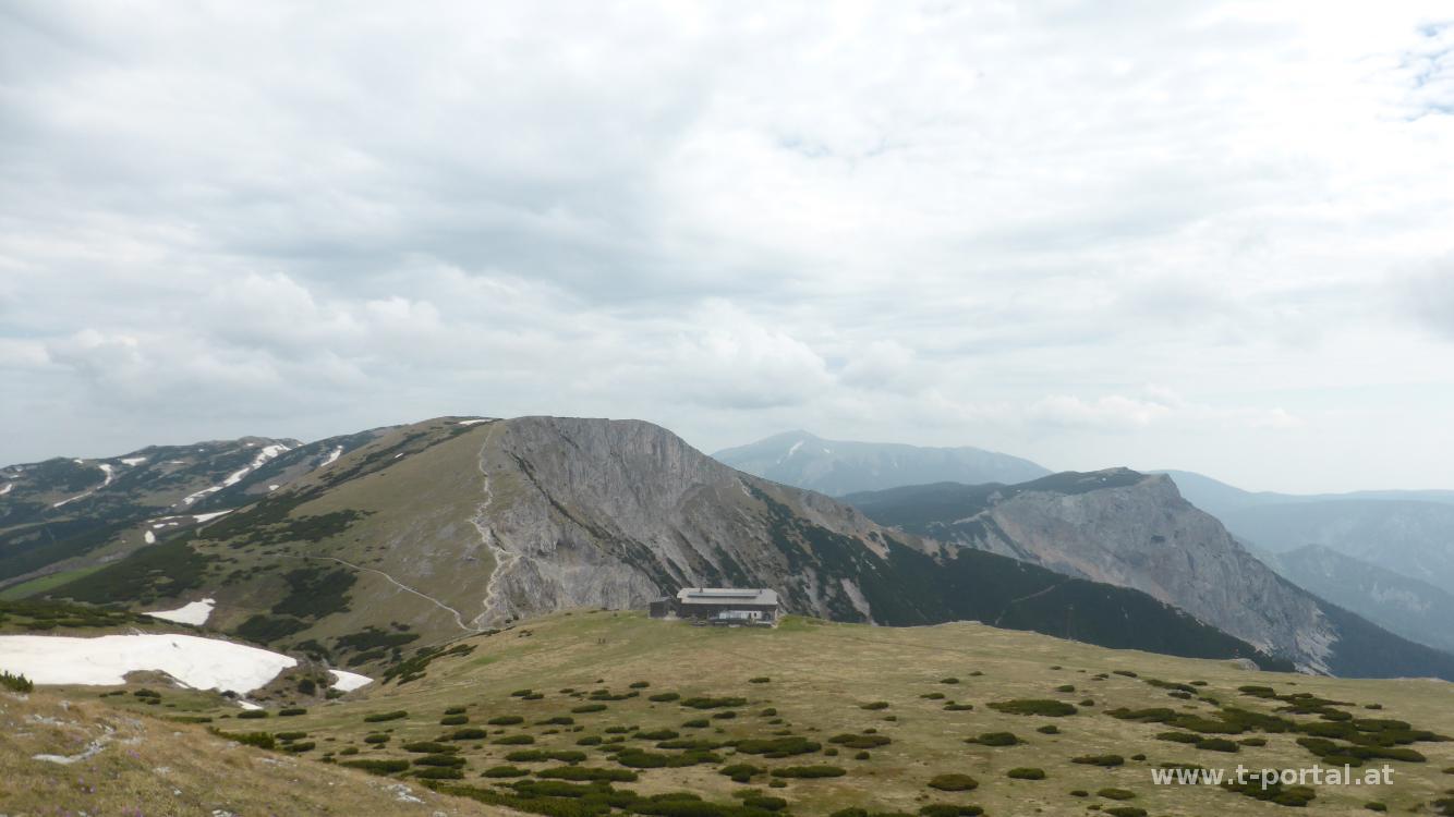Das war es auch schon wieder mit der Klettersteigeinlage. Nachdem eh ziemlich der Wind pfeift, verzichten wir auf die Heukuppe und gehen am Pfad weiter zum Karl Ludwig Haus, wo wir unsere verdiente Stärkung einnehmen. Nachdem das Wetter noch hält, beschließen wir, nicht gleich abzusteigen sondern gehen über den Predigtstuhl weiter zum Waxriegel. Als wir bei der Raxgmoa (Hans Nemecek) Hütte am Trinksteinsattel vorbeikommen grummelt der Himmel etwas, das Wetter zieht aber mehr Richtung Schneeberg und Gloggnitz. Trotzdem schauen wir, dass wir bald die neuen Seehütte erreichen.