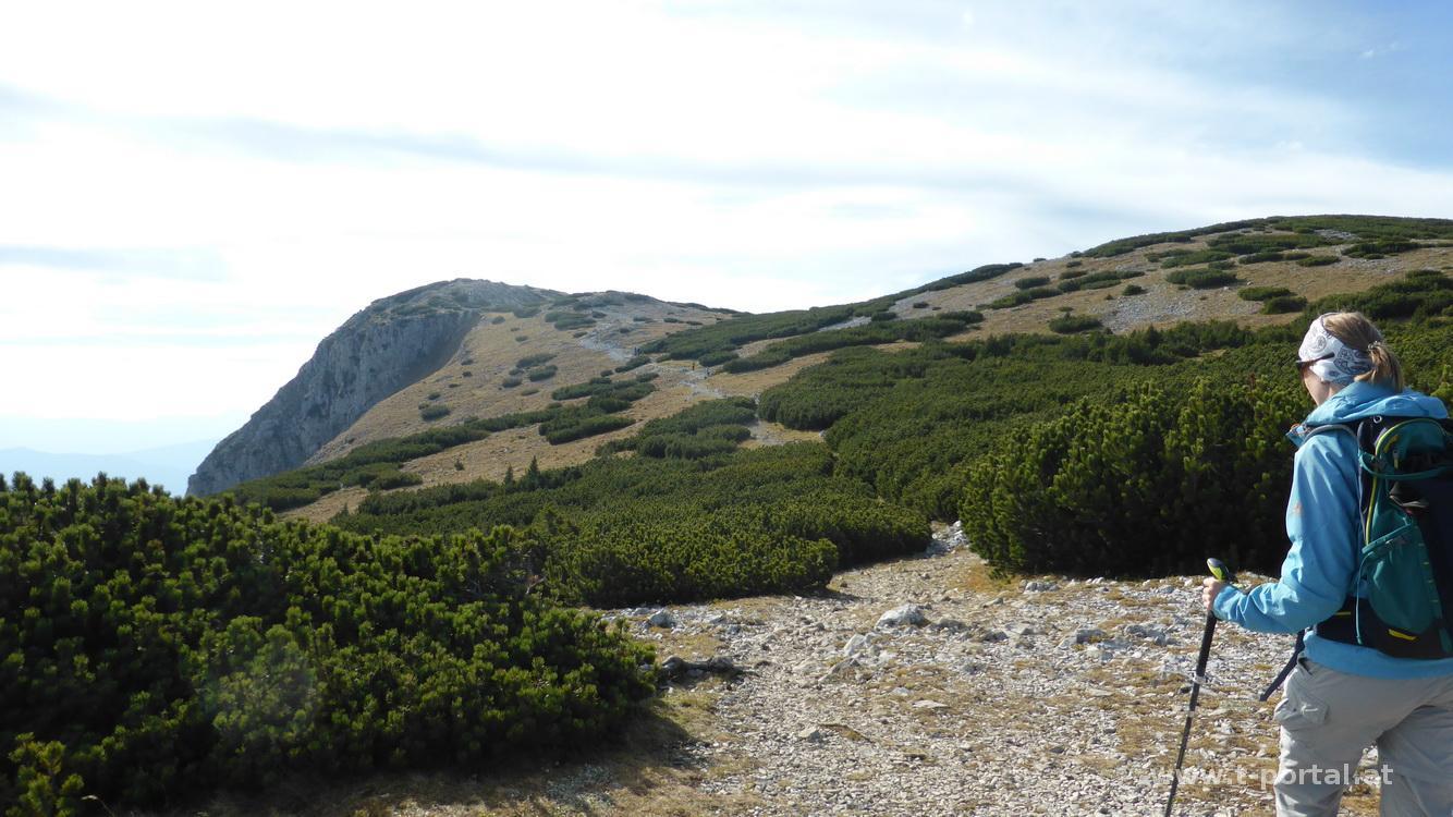 Danach marschieren wir nach vor zum Ottohaus, vorbei an den Massen und rauf zum Jakobskogel. Nach kurzem Rundumblick entschließen wir uns noch weiter zum Preinerwandkreuz zu gehen. Durch Latschen und über Schotter geht es etwas auf und ab, bis wir das Kreuz erreichen. Während das Wetter am Vormittag noch wunderbar sonnig war, hat es hier etwas zugezogen und kalter Wind bläst uns um die Ohren. Also steigen wir rasch zur Seehütte ab, wo wir uns einen Kuchen suchen. Nach Stärkung gehen wir am Seeweg retour zum Ottohaus und zweigen am Praterstern auf den Wachthüttelkamm-Steig ab. Dieser führt recht lange gemütlich über Wiesen und Wald hinab und man fragt sich, wann endlich die Höhenmeter weniger werden. Dies passiert aber erst am Ende des Steigs, über zahlreiche Eisentreppen und ein einige kurze gesicherte Stellen führt der Weg nun steil hinab. In der Dämmerung erreichen wir wieder die Straße und gehen zurück zum Weichtalhaus. Nach gutem Abendessen machen wir uns auf den Heimweg.