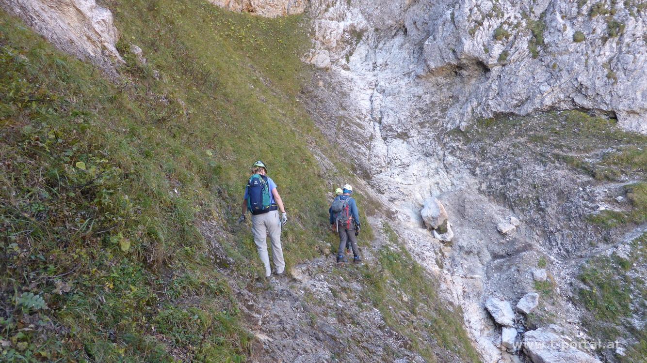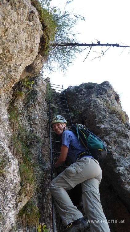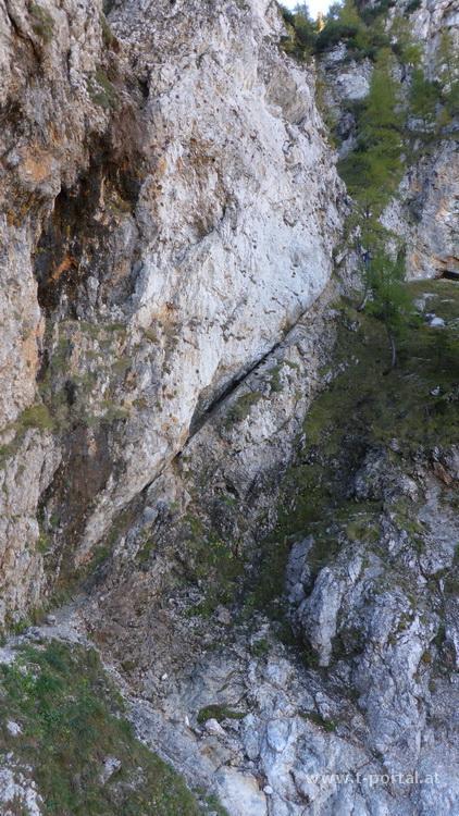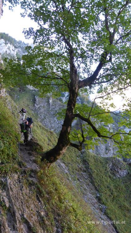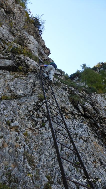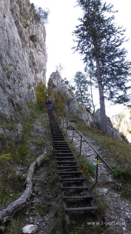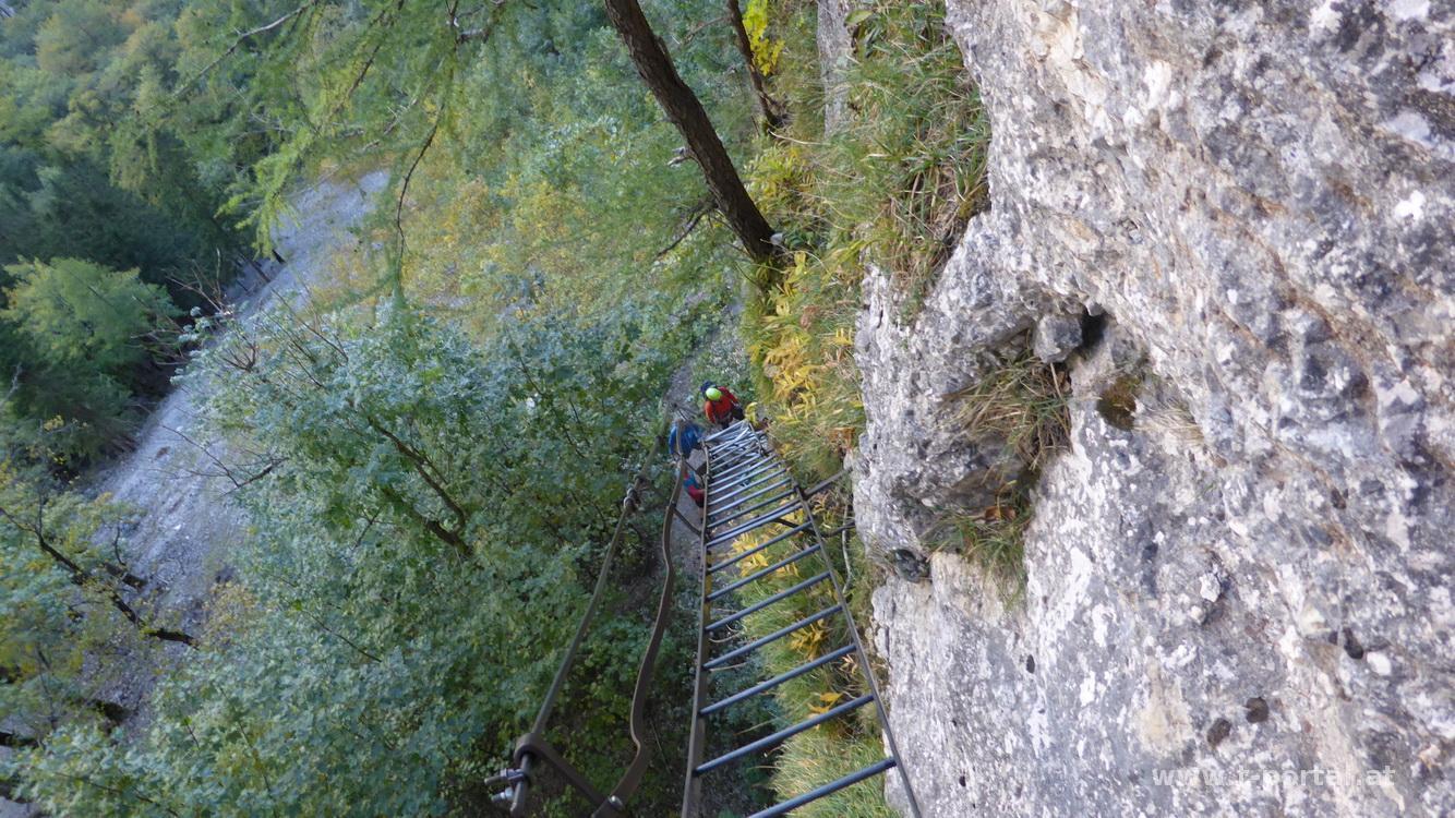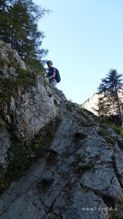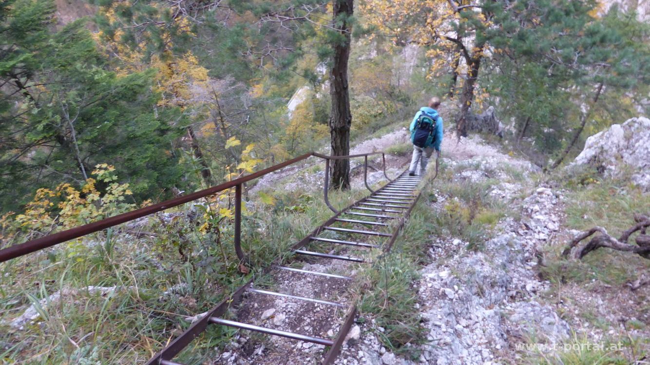 Der Steig ist mit B bewertet, wir gehen ohne Klettersteigset aber mit Helm. Zuerst geht es gleich mal eine schräge lange Leiter aufwärts, um ein Eck zur nächsten Leiter, vorbei an einer kleinen Höhle und nun in die andere Richtung auf der nächsten Leiter weiter. Es folgt das nächste Eck, eine kürzere Leiter und etwas Gehgelände bis eine weitere Leiter folgt. Nach dieser ersten Leiterpassage folgt steiles Gehgelände. In Kehren geht es nun hinauf zu einem markanten Baum. Hier folgt das nächste gesicherte Stück in dem der schräge Hang gequert wird. Wir müssen teilweise etwas warten, da doch ein paar Leute unterwegs sind und genießen den Ausblick ins Höllental und auf die Felswände der Umgebung. Nach der Querung wird das Gelände etwas flacher, aber neben uns geht es noch immer gut hinunter. Wir queren eine Schuttrinne und steigen im Wald nun steiler auf. Wieder geht es im schrägen Gelände weiter, über die nächste Schuttrinne und weiter aufwärts. Über Trittplatten steig der Weg weiter hinauf. Zwischendurch sehen wir die erste Gams des Tages und kommen um ein Eck zum bekannten Verschneidungs-/Kaminteil. In diesem etwas feuchten Stück geht es über abgespeckten Fels und Trittplatten hinauf. Gut, dass es auch noch ein Seil gibt, ansonsten wäre mir das wohl zu suspekt gewesen. Auf steilen Gehgelände gelangen wir zur nächsten Leiter bei der der Gustav-Jahn-Steig (B/C) einmündet.